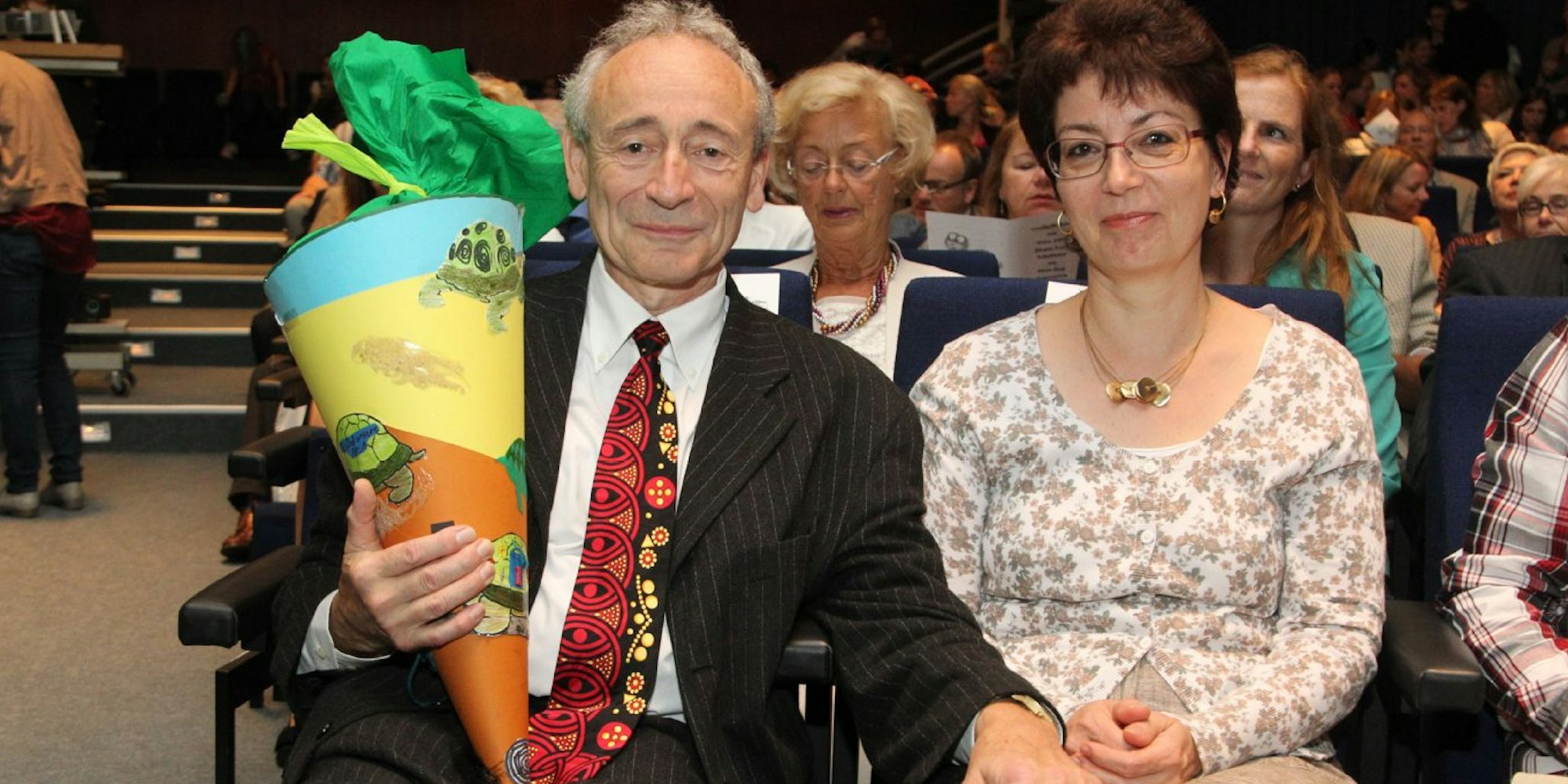 Das RSG gilt als Vorzeigeschule, auf der es zwischen Schülern, Eltern und Lehrern noch richtig klappt, noch alle zusammenstehen und deshalb ein sehr gutes Lern- und Lehrklima herrscht. Nicht umsonst sagte Sankt Augustins Bürgermeister Klaus Schumacher: „Ich freue mich nicht.“ Das sollte sich schnell ändern bei einer überaus spaßigen Abschiedsshow. Sekretärin Claudia Leuwer trug natürlich hochgeschlossen und in den Händen ein Pappschild mit Schildkrötenmotiv. Franz hat davon zwei lebendige im heimischen Garten und eine ganze Menge Figuren in seinem Schulleiterbüro.