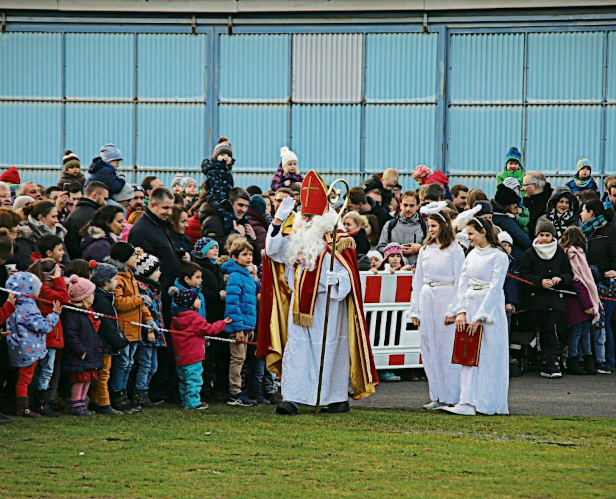 So schritt er die Reihen ab, rund 1200 Menschen waren auf den Platz vor dem Hangar des Aeroclubs gekommen. Die Jugendgruppe hatte 450 Kärtchen ausgegeben, die zum Empfang einer Geschenktüte berechtigten. Zum 54. Mal hatte die Fliegergemeinschaft Hangelar den fliegenden Nikolaus bestellt.