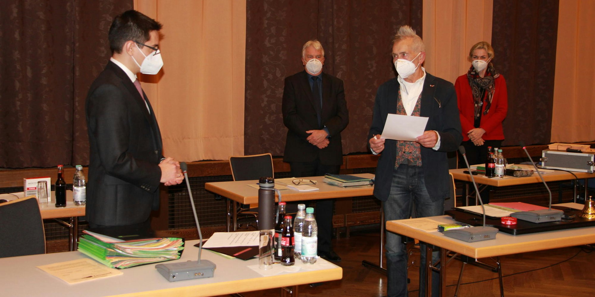Bürgermeister Max Leitterstorf (links) wird von Wolfgang Köhler zu Beginn der Sitzung vereidigt.