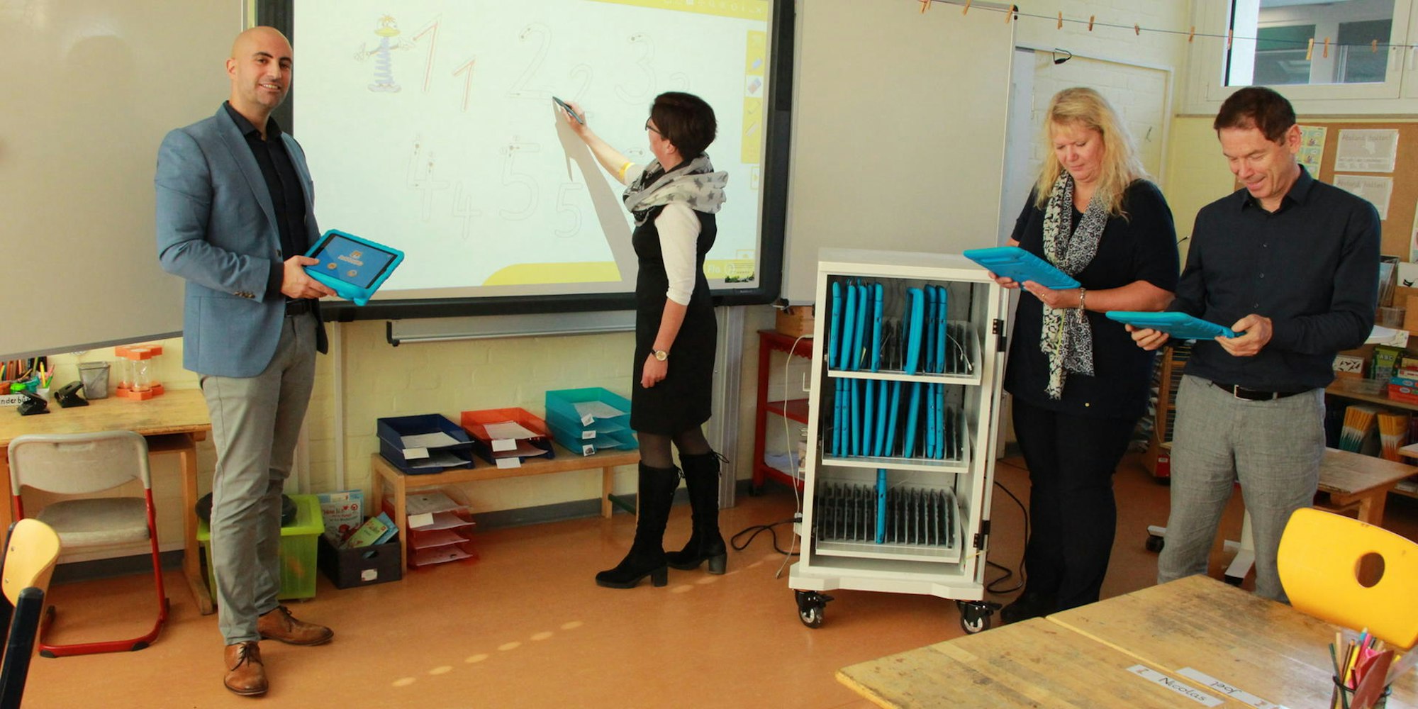 Jetzt geht es darum, wie die Pläne im Tagesgeschäft umgesetzt werden können. Welche Hardware kommt zum Einsatz? Welcher Fortbildungsbedarf besteht in der Lehrerschaft? Die katholische Grundschule Sankt hat schon einen Klassensatz mit Tablets, die Tafel ist ein Whiteboard. „Die Informationen werden durch einen Beamer auf die Fläche projiziert. Den Kindern macht das Lernen so viel Spaß“, berichtet Petra Böhnert-Hacker aus der Schulleitung. Die Tablets sind multifunktional und bieten ganz ungewohnte Unterrichtsinhalte.
