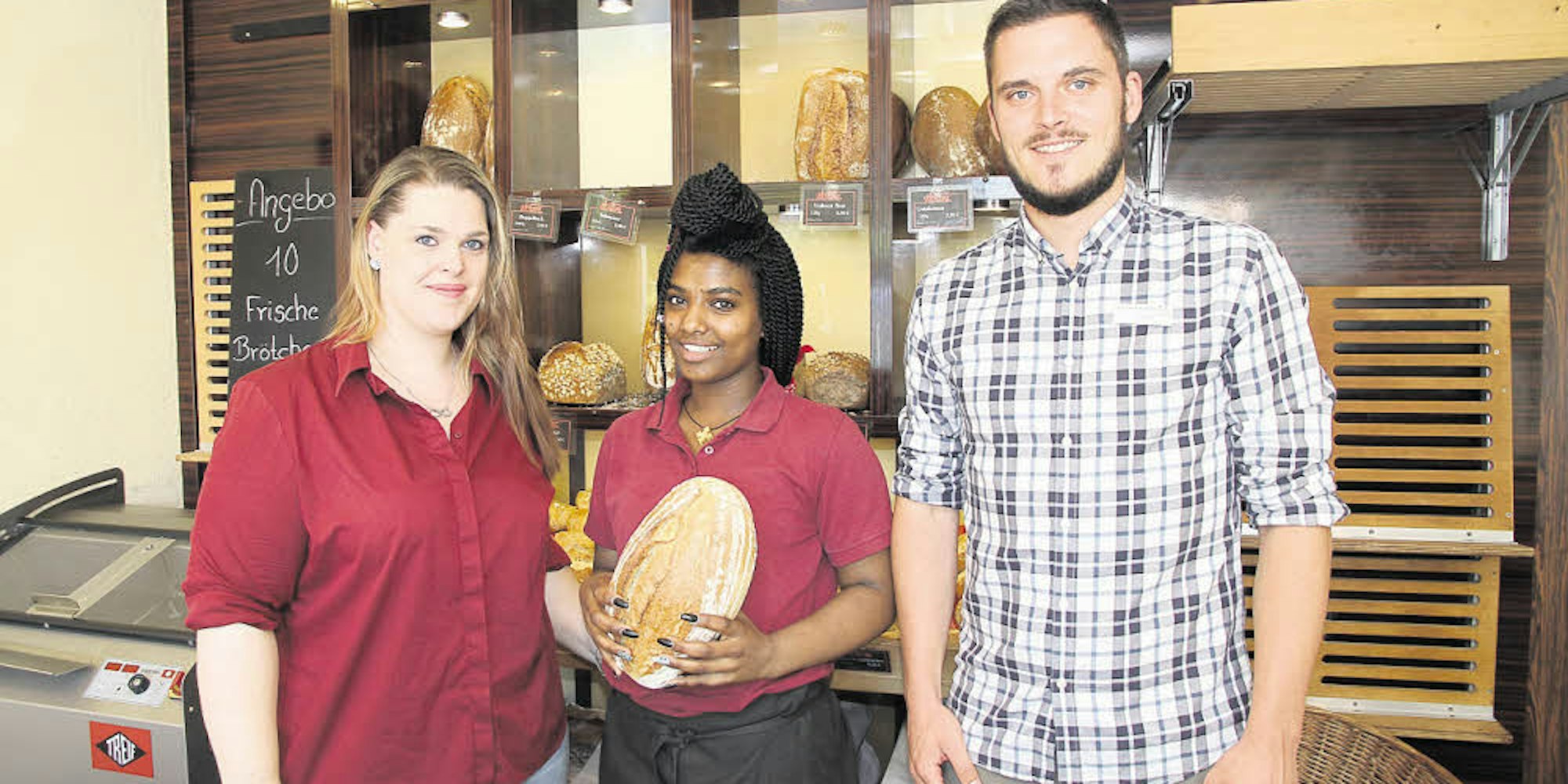 Bäckereichefin Constance Dorfinger (l.) und Arbeitsvermittler Jan Meyer freuen sich, dass Denait Mulue im Geschäft bleiben kann.