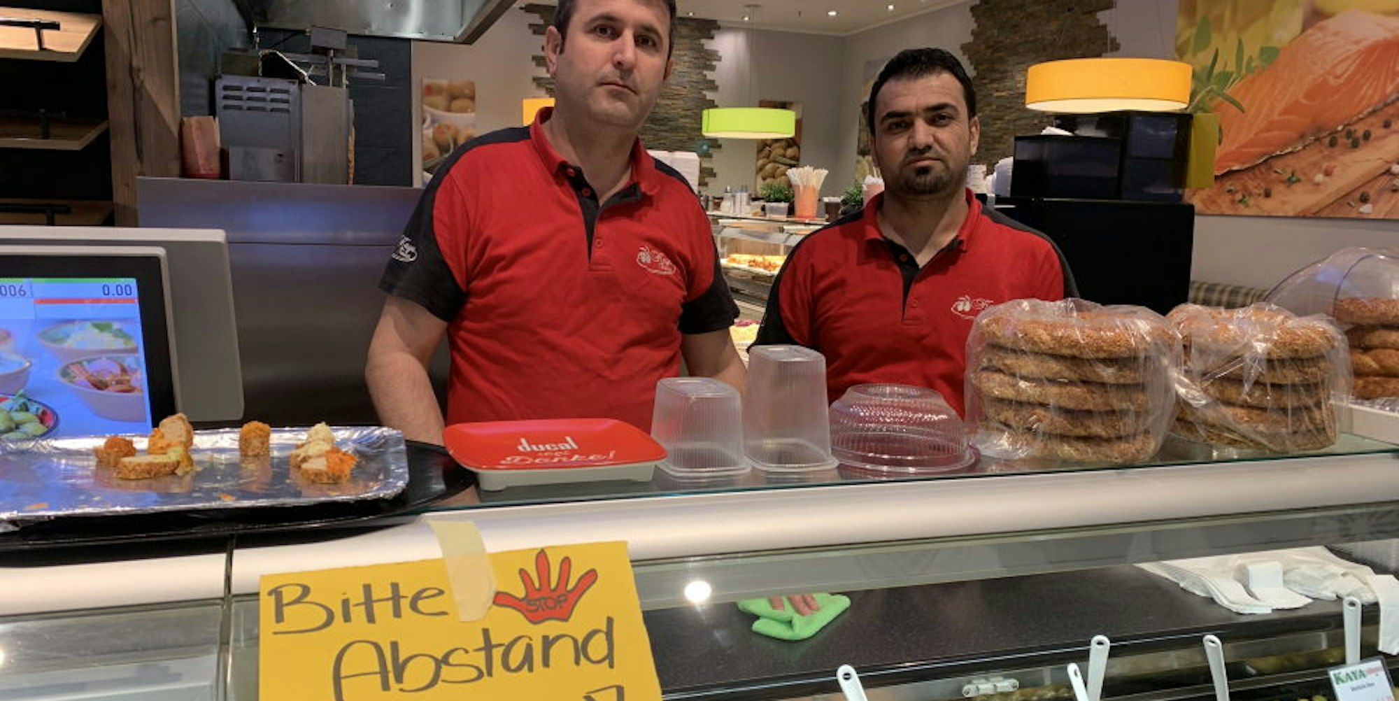 Abdurrahim Kansiray und Jabro Askan warten am Imbiss auf Kunden. Ein gut sichtbares Schild bittet, Abstand zu halten. „In spätestens drei Tagen können wir die frisch angerührten Pasten nicht mehr verkaufen“, sagt Kansiray. Im hinteren Teil des Ladenlokals, wo sonst gut gelaunte Kunden mit gefüllten Tellern sitzen, sind Tische und Stühle gestapelt. Vor Ort essen sei nicht mehr erlaubt. „Deswegen haben wir alles übereinander gestellt, damit das jeder sieht“, so Askan. Auch gegenüber in der Bäckerei sind die Auslagen noch gut gefüllt. „Wir verkaufen deutlich weniger“, so eine Verkäuferin.