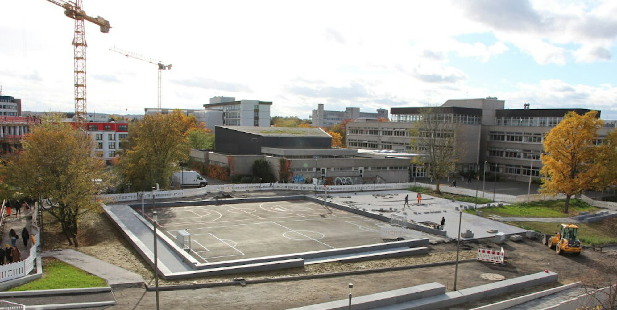 Eine moderne Treppenanlage mit Rampen und die beiden neuen Sportplätze prägen den umgebauten Platz.