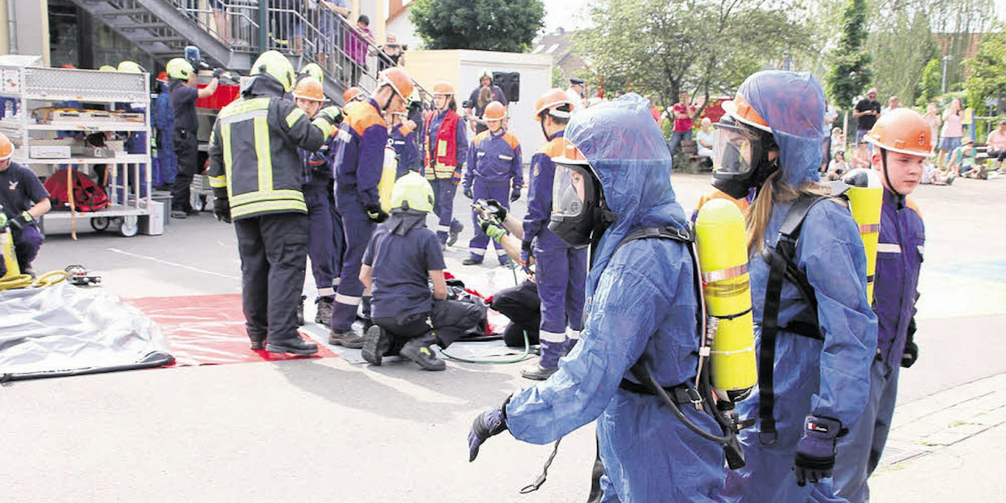 Anschließend kamen die Mülldorfer, die zwei Dachdecker vom brennenden Dach der Halle retteten. Hangelar, Menden, Meindorf und Buisdorf stemmten zusammen einen ABC-Einsatz. Das Szenario: Im Unterricht war eine unbekannte Substanz ausgetreten.