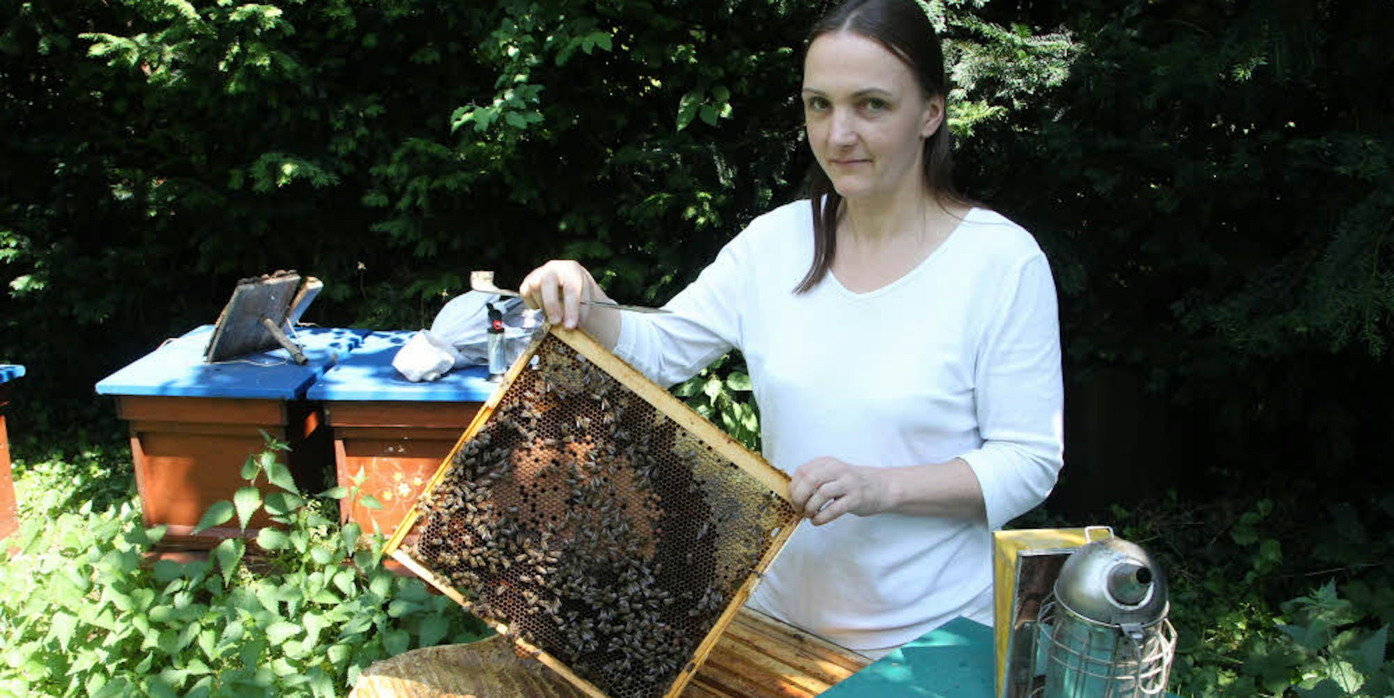 Bienen sind ihre Leidenschaft und ihr Beruf: Insgesamt 65 Bienenvölker, davon elf in ihrem Garten, unterhält Imkerin Nicole Saturna aus Sankt Augustin.