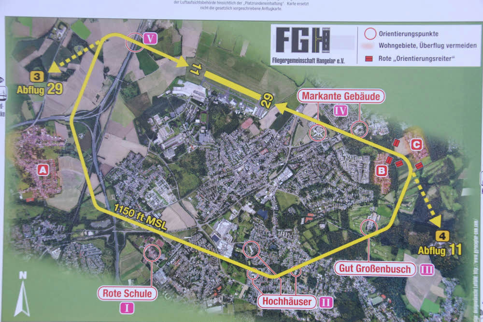 Vor allem Fluglehrer und ihre Schüler nutzen die gelb eingezeichnete Platzrunde. Die roten Vierecke um die Absturzstelle sind von oben sichtbare Markierungspunkte, damit Piloten möglichst exakt die Strecke fliegen. 1150 ft sind etwa 350 Meter, die zu fliegende Höhe über Meeresspiegel.
