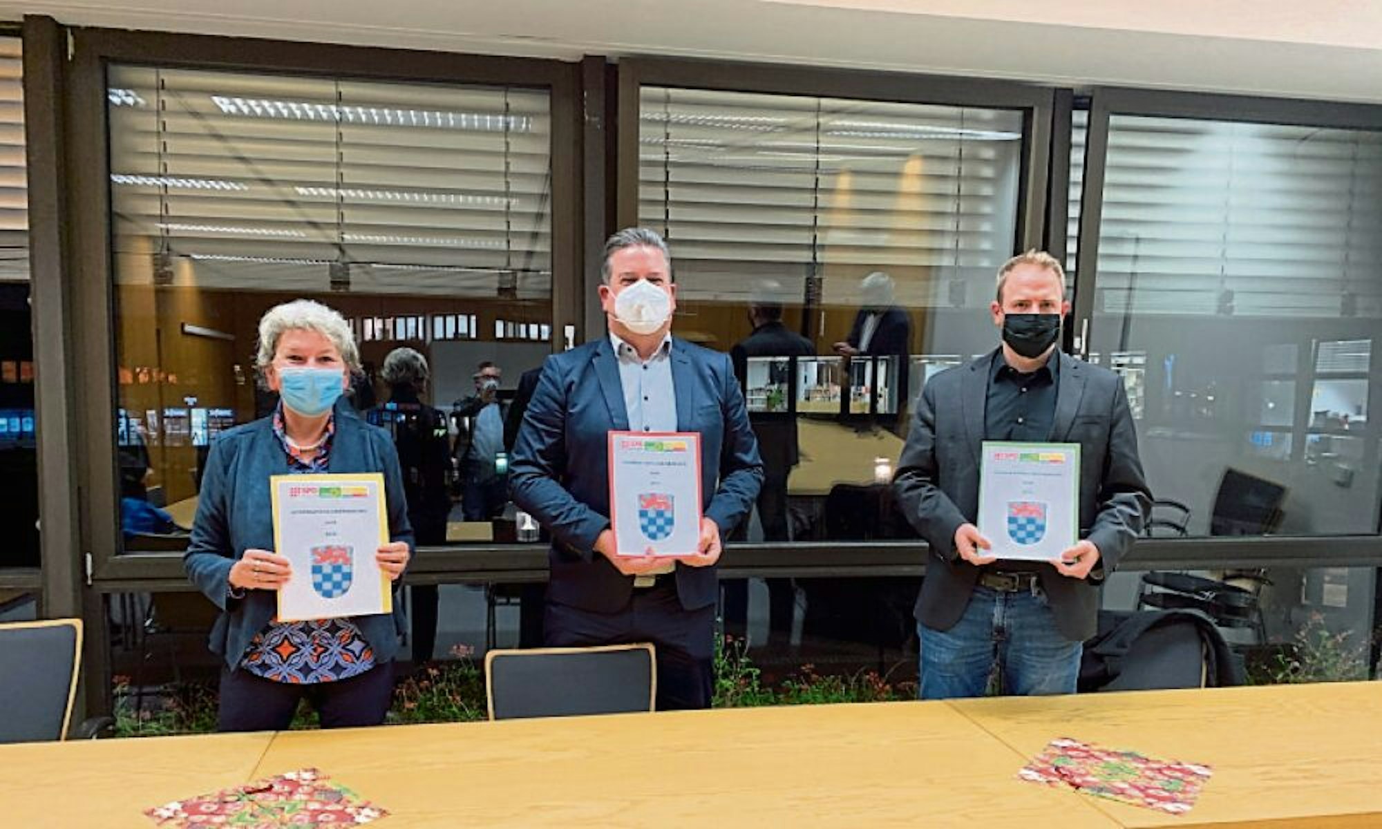 Die Fraktionsgeschäftsführer der „Smarties-Koalition“ mit ihrer Kooperationsvereinbarung: (von links) Stefanie Jung (FDP), Marc Knülle (SPD) und Martin Metz (Grüne).
