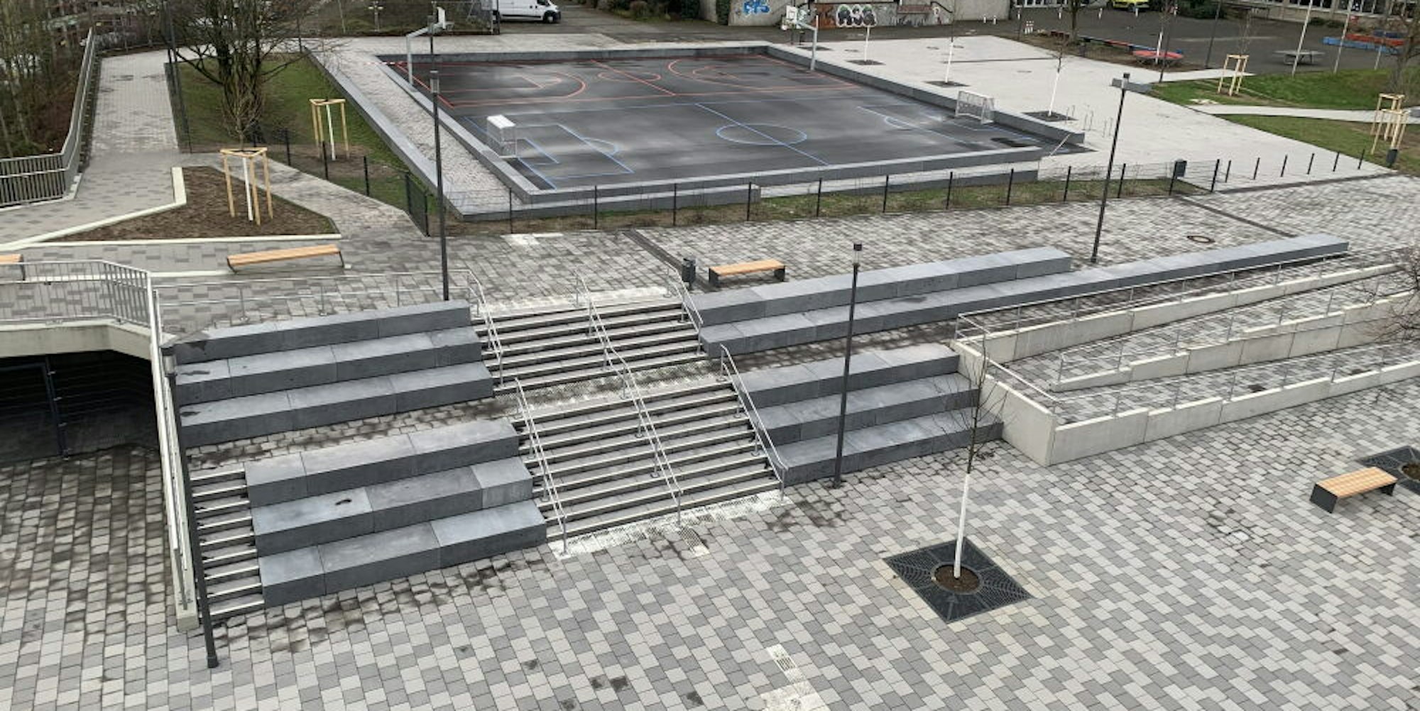 Farbliche Markierungen kennzeichnen die Spielfelder auf dem Sportplatz, zu dem Treppen und Rampen führen.