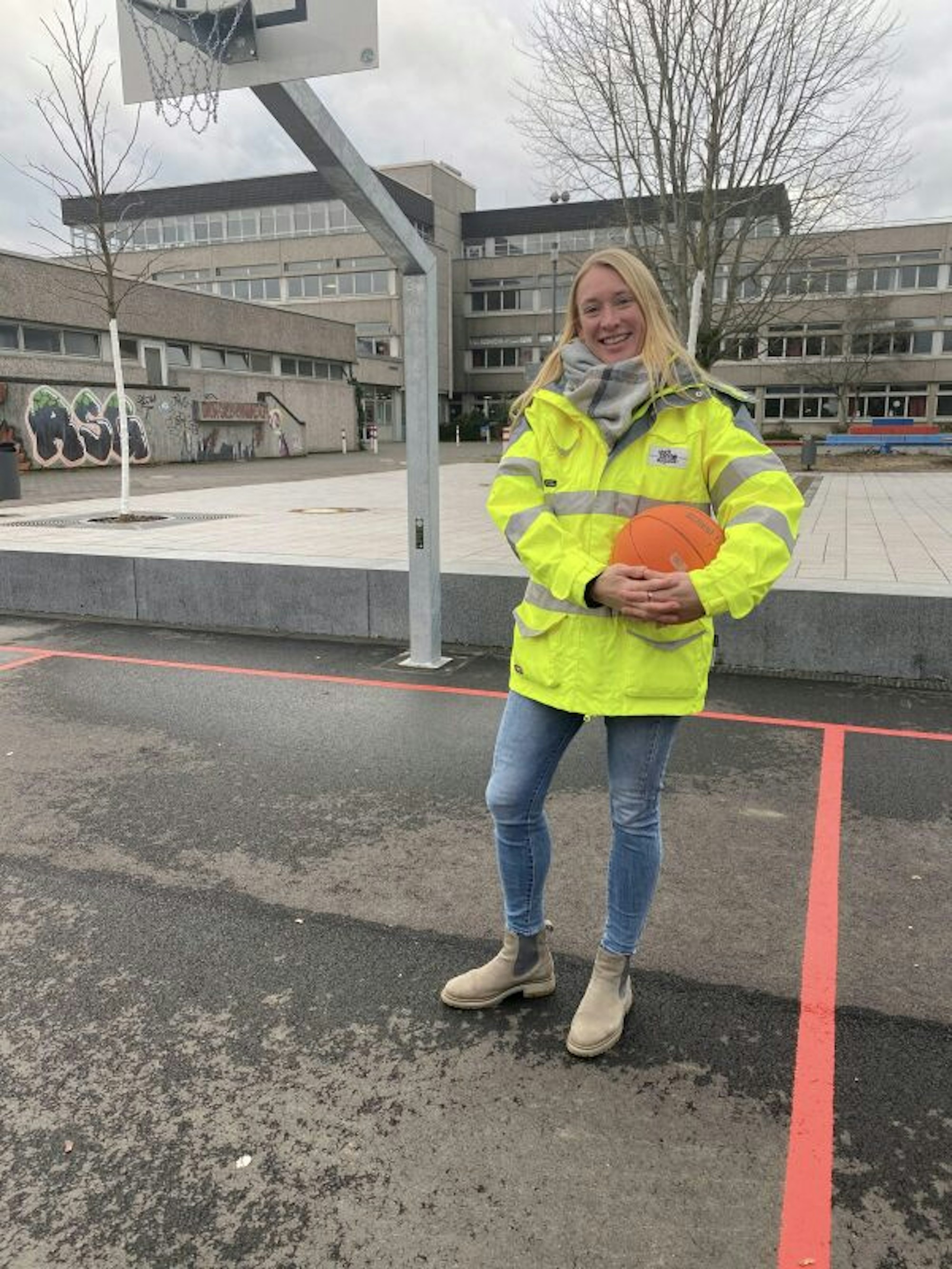 Ingenieurin Tina Lorenz ließ es sich nicht nehmen, persönlich die neuen Basketballkörbe zu testen.