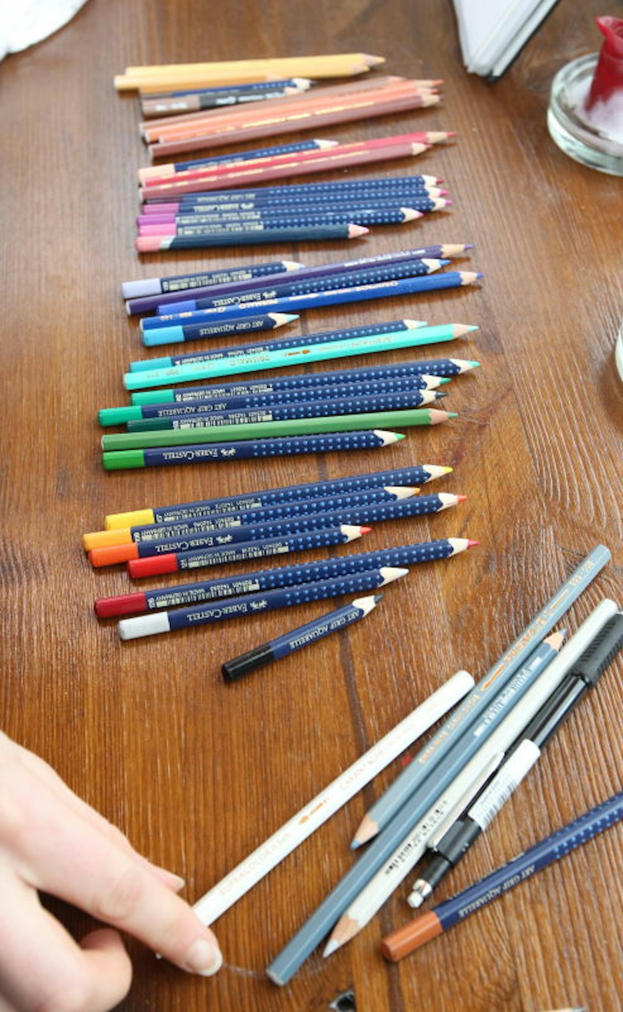 Merle Stankos Armbanduhr piept, die Hälfte der Zeit ist um. Stanko legt den Bleistift beiseite und greift nach Buntstiften und Aquarell-Kreiden. Sie liegen nach Farben sortiert neben ihr auf einem kleinen Tisch. Das Mädchen trägt einen blauen Schal, ohne zu überlegen wählt Stanko den passenden Farbton. „Zeichnen“, erklärt sie, „heißt vor allem richtig gucken zu lernen“.