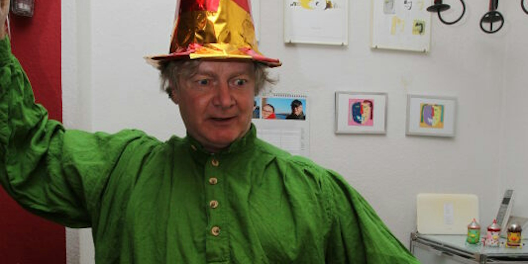 Ausstaffiert mit spitzem Hut für die Mitmachshow: Wie Redakteur Klaus Heuschötter verfolgten in ganz Deutschland Zuschauer den Live-Stream aus Sankt Augustin.