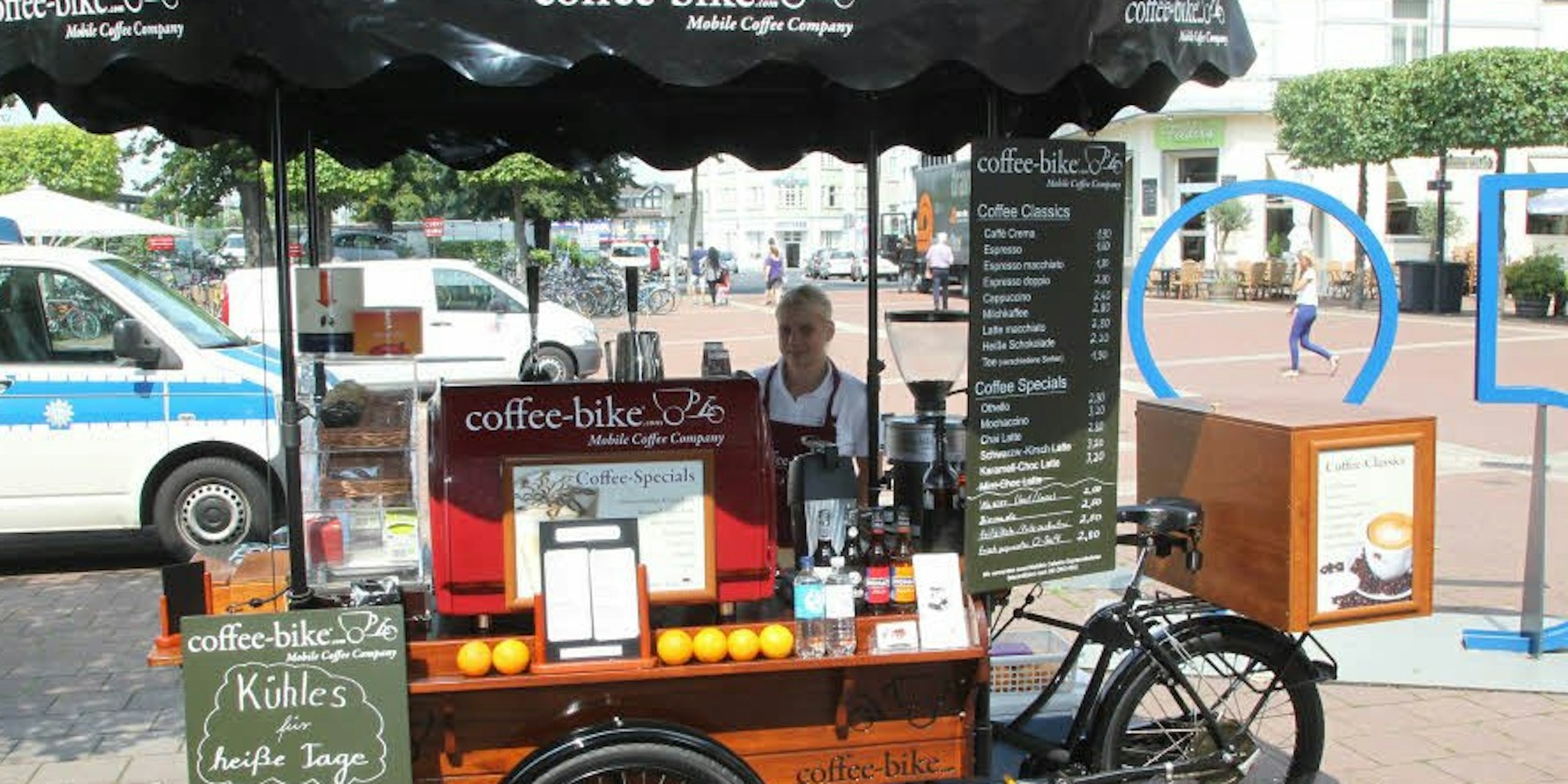 Coffee-Bike am Bahnhof SiegburgRollendes Geschäft mit frischem Kaffee