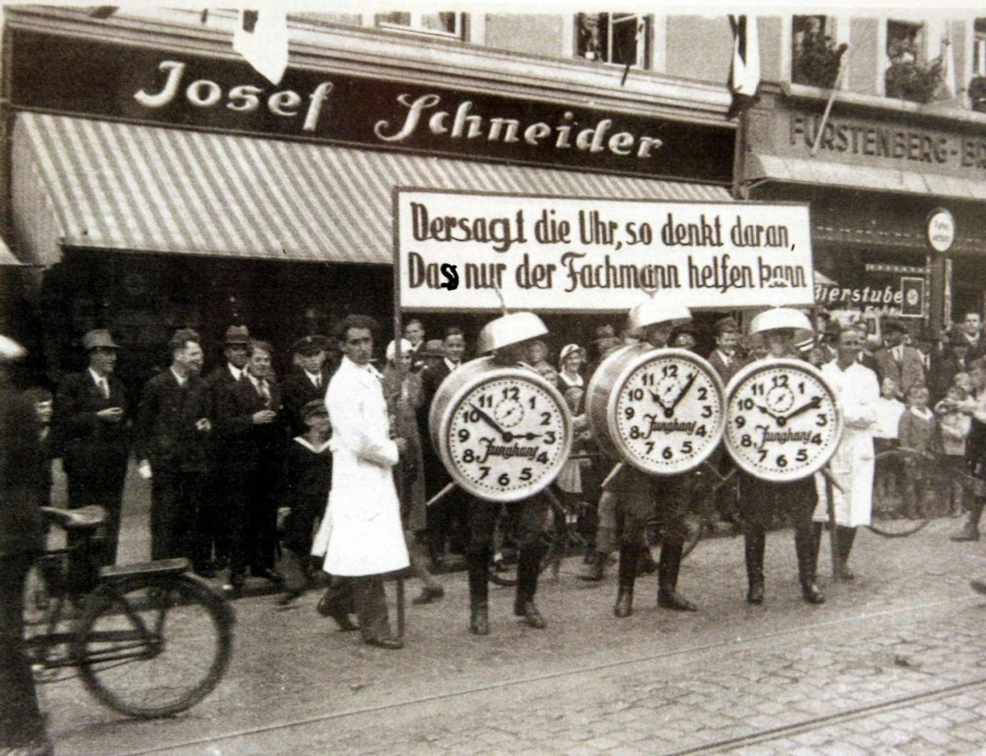 Als wandelnde Uhren gingen die Handwerker 1934 im Rosenmontagszug mit, warben für ihre Zunft und deren Fachkenntnis.