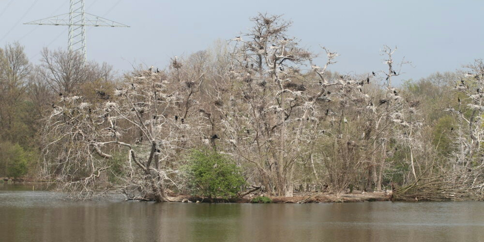 Die Inseln im Trerichsweiher sind als Rastplätze bei Kormoranen beliebt.
