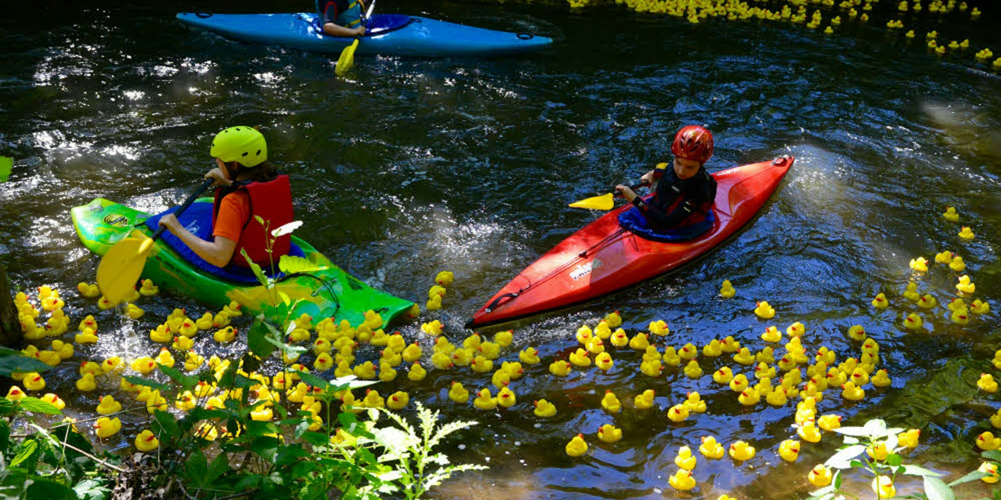 Schon kurz nach dem Start brauchten einige Entlein Anschub, Kanuten brachten die Gummitierchen wieder auf Kurs.