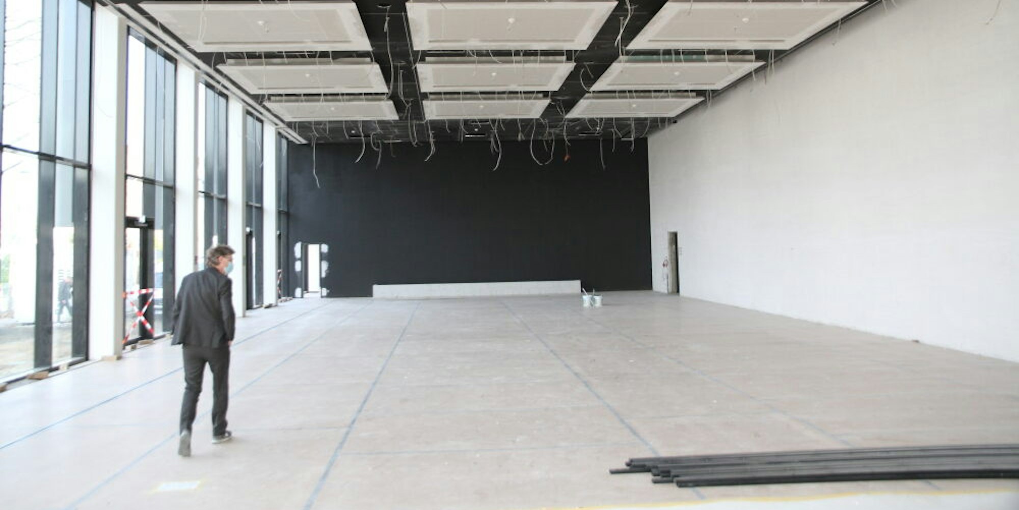 Deutlich erkennbar ist schon der neue kleine Saal, der im Erdgeschoss vom Foyer abgetrennt werden kann. 320 Plätze für Gäste an Tischen wird er einmal bieten, im hinteren Abschnitt kann eine mobile Bühne installiert werden. Das Parkett ist bislang, wie auch die Fliesen im Neubau, noch mit einer Schutzhülle bedeckt. Fortschritte macht auch der Innenhof, der auf dem Erdgeschoss angelegt wurde, und Platz für Grünpflanzen und sogar drei Bäume bieten wird. Später könnten dort kleinere Kulturveranstaltungen laufen. Fenster eröffnen den Blick in den alten Saal, die planerische Idee: „In die alte Halle soll auch weiterhin natürliches Licht fallen“, so Kuchheuser.