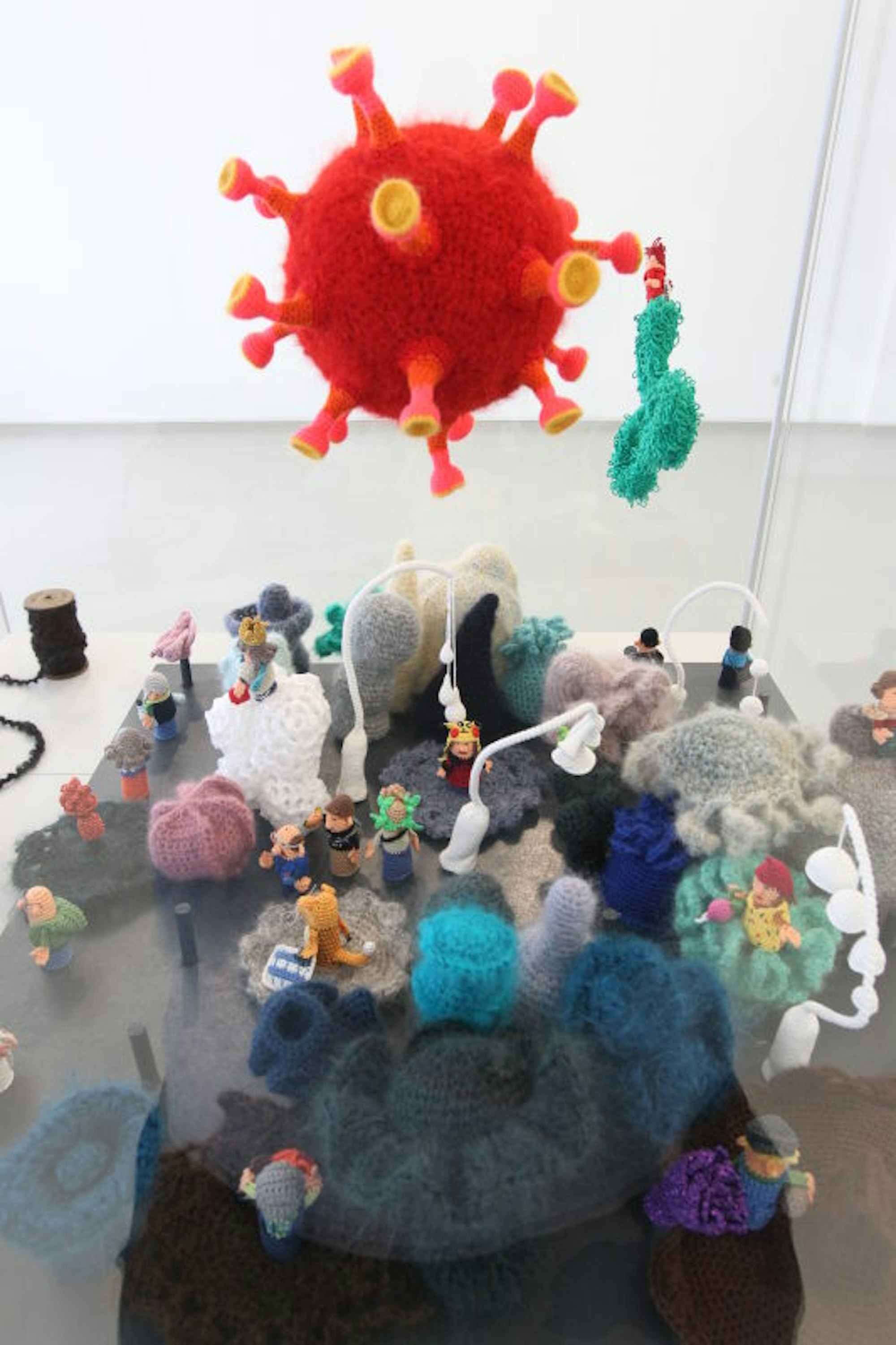 Siegburg – Als fingerlanges Püppchen schwebt die Künstlerin über ihrem textilen Welttheater; in der Hand hält sie ein Mini-Wollknäuel in Grün - bekanntlich die Farbe der Hoffnung. Und grün ist denn auch Katharina Krenkels gehäkelter „Antikörper“ in einer Schleifenform, die an ein Kleeblatt erinnert. Aber den Mittelpunkt der großen Vitrine nimmt knallrot das wollene Virus wie ein außerirdisches Objekt ein. „Einfach schön und zum Knuddeln“, beschreibt Museumsdirektorin Dr. Gundula Caspary die fußballgroße Version von Covid 19.