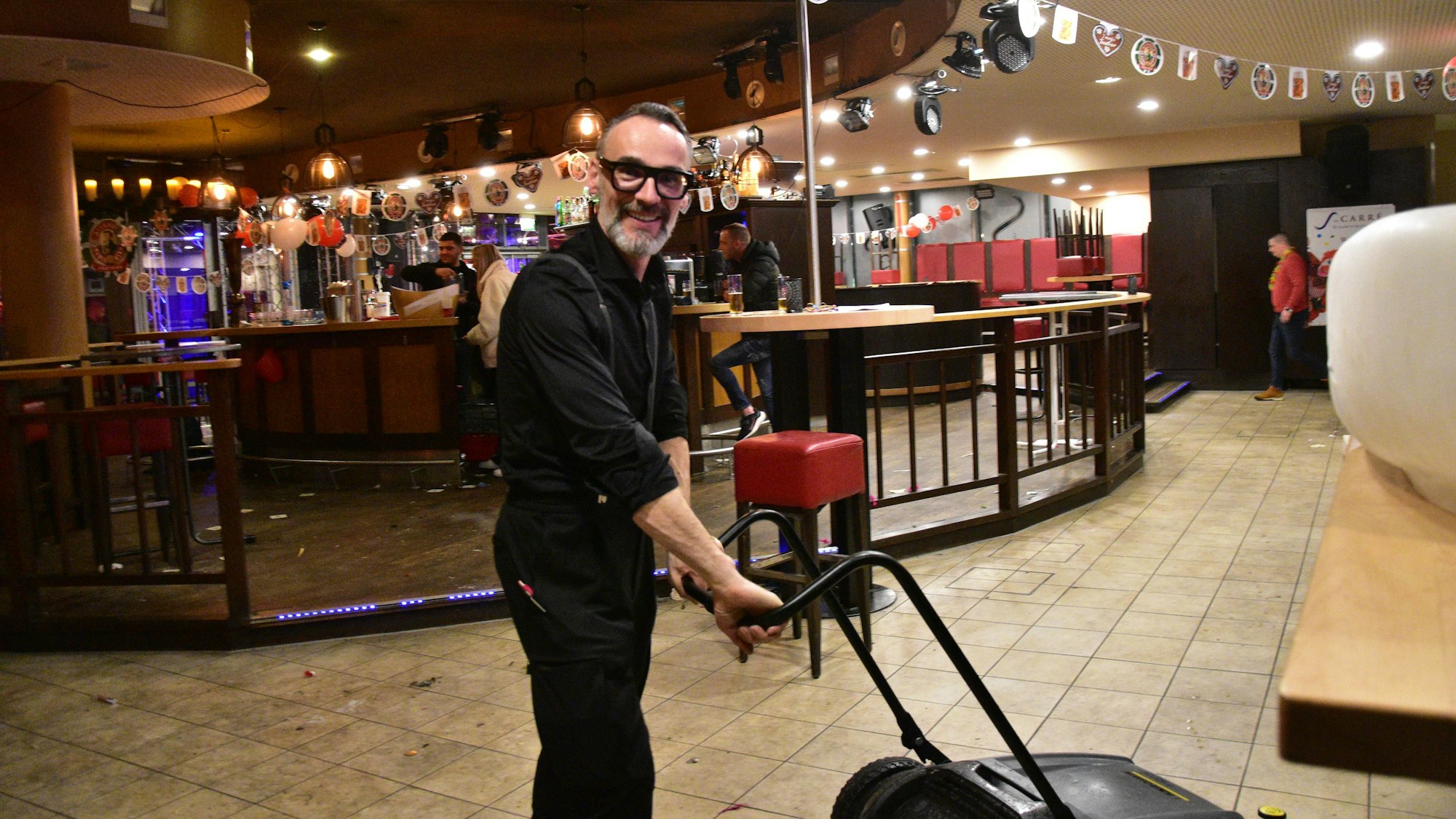 Bei jedem Schritt knirschen die Glasscherben, der Boden klebt. Kehren, Wischen und Scherben aufsammeln ist angesagt. Wenn die Jecken nach einem langen Weiberfastnachts-Tag durch die Siegburger Innenstadt ihren Weg nach Hause suchen, beginnt bei Augustin Bagaric das große Aufräumen. Der Inhaber des Sion im Carré hatte gestern von 11 bis 23 Uhr geöffnet, 30 Mitarbeiter waren insgesamt im Einsatz, um dem großen Aufkommen gerecht zu werden.