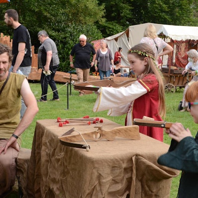 Auch die Ritter im Mittelalter hielten das nicht lange durch. „Die Kämpfe waren kurz“, erklärt Jörg Wilhelm, als er wieder bei Atem ist. Raziel taucht die Hände in den bereitstehenden mit Eimer mit Siegwasser und schaufelt sich das Nass ins Gesicht.