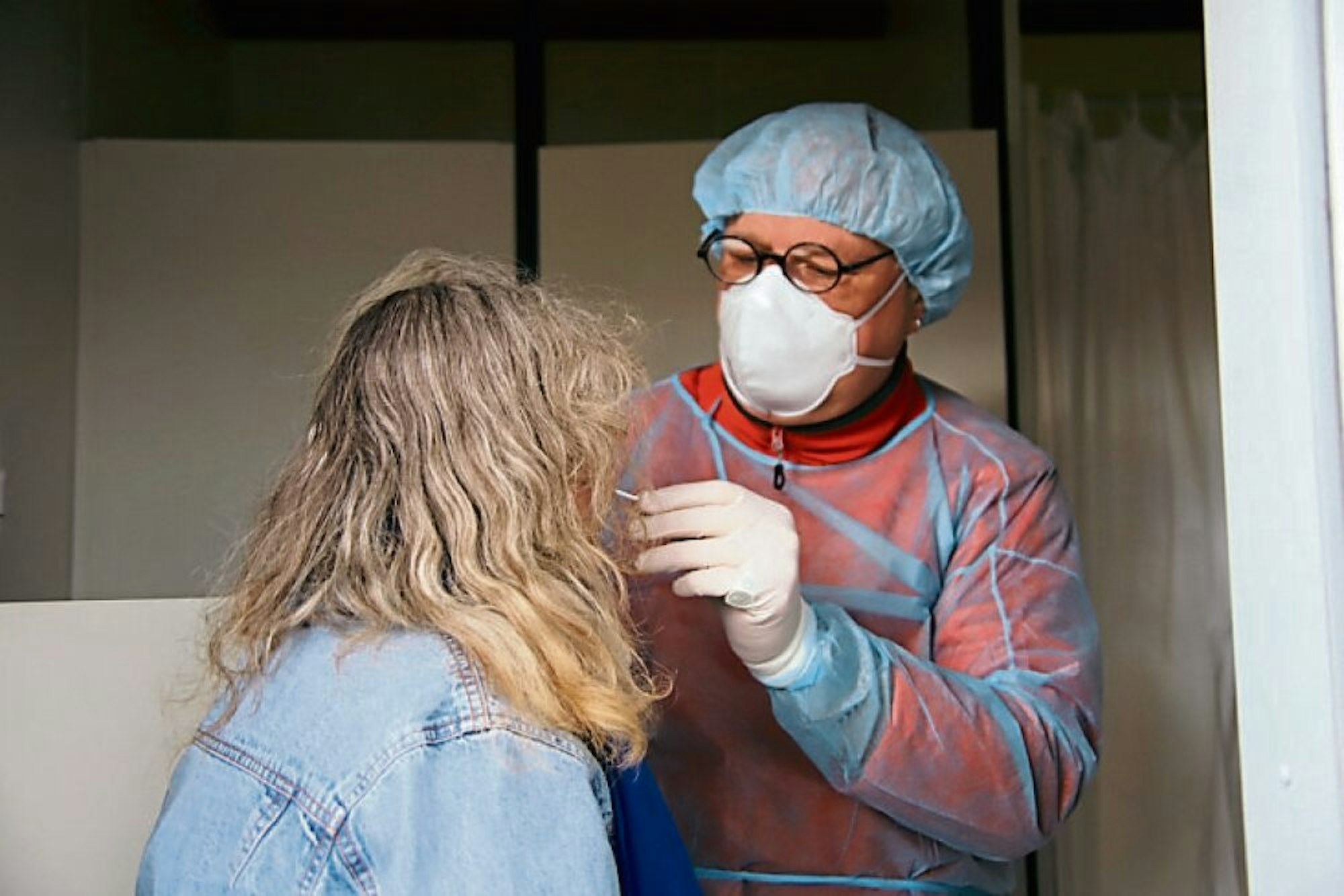 Bert Becker macht bei einer neuen Besucherin der Notschlafstelle den obligatorischen Schnelltest, bevor sie ins Haus darf.
