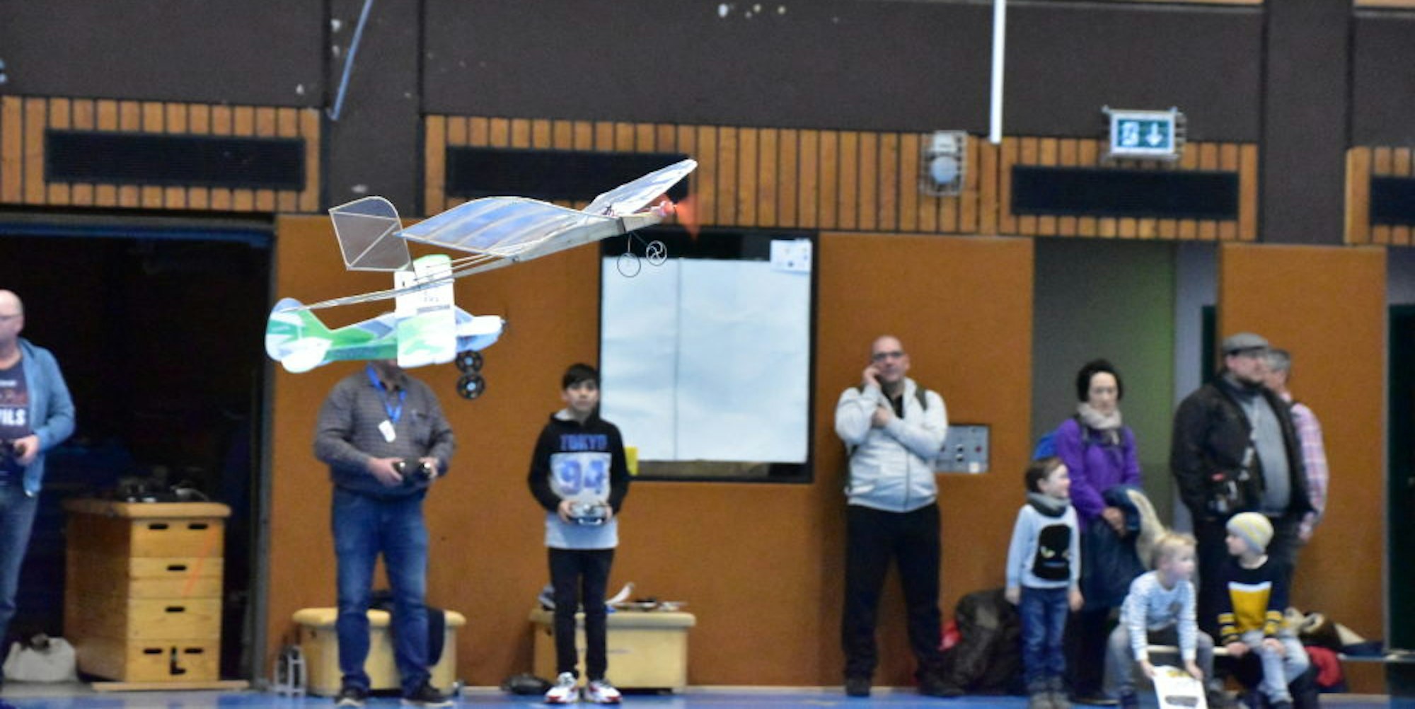 „So habe ich auch mal angefangen“, berichtete der Vorsitzende des Flugmodell-Sportclubs Siegburg, Michael Schlipköther, der wie weitere Piloten des Vereins in der Sporthalle seine Flugkünste vor allem mit Leichtfliegern aus Depron oder ähnlichen Kunststoffen vorführte. Die schwereren Maschinen lässt der Verein regelmäßig auf seinem Flugfeld an der Wahnbachtalstraße starten.