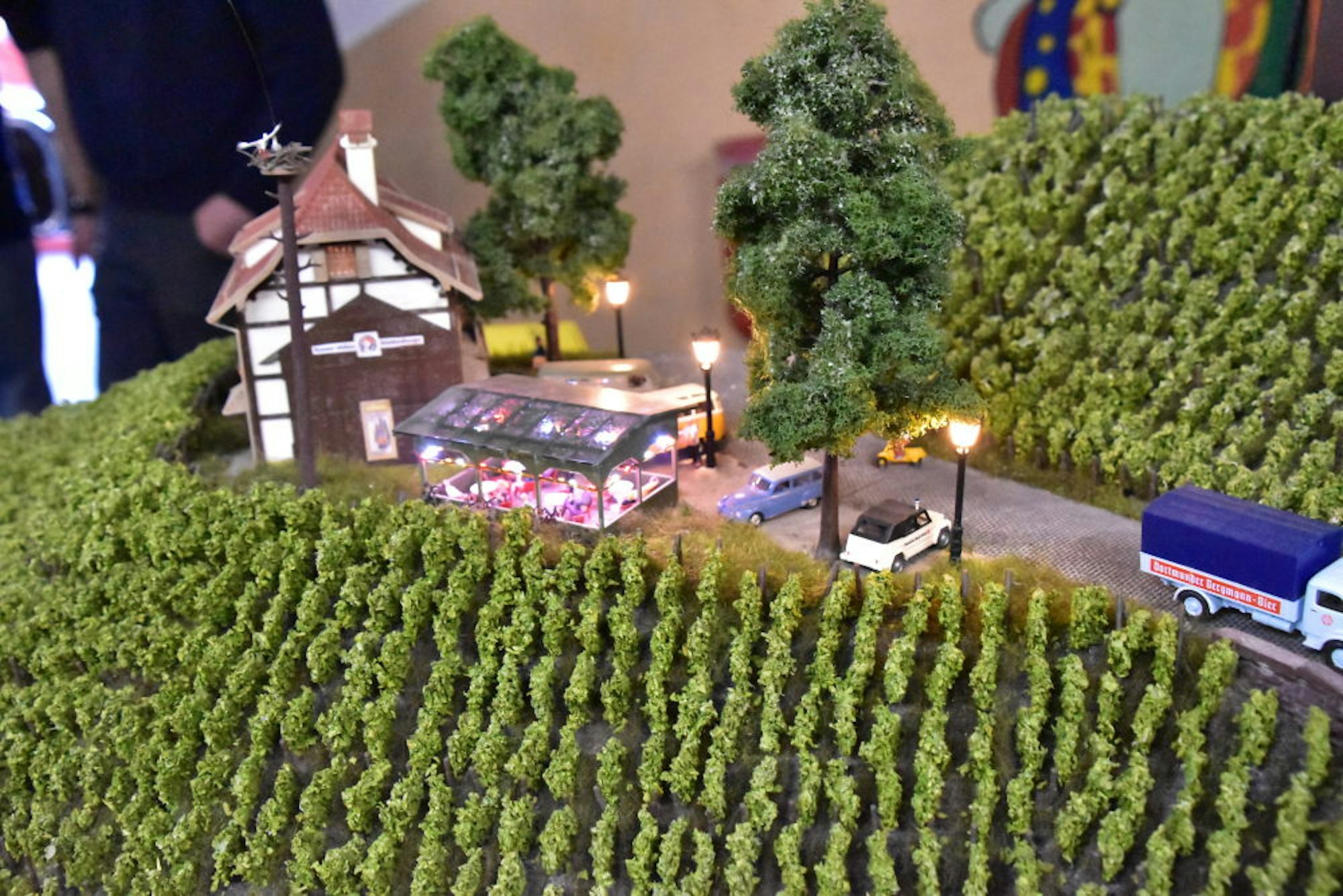 Wesentlich schwereres Gerät als bei den Fliegern gab es beim Eisenbahnclub Rhein-Sieg gleich nebenan im Forum des Schulzentrums zu sehen. Acht Anlagen konnten bestaunt werden, darunter die eigene des Vereins, für deren neues Eckmodul der Vorsitzende Uwe Bodenstein noch eigenhändig 3600 Weinstöcke belaubt und „gepflanzt“ hatte. In Reih und Glied wie im Original im Rheintal ergaben sie ein tolles Modell mit Ausflugslokal und Weinlese.
