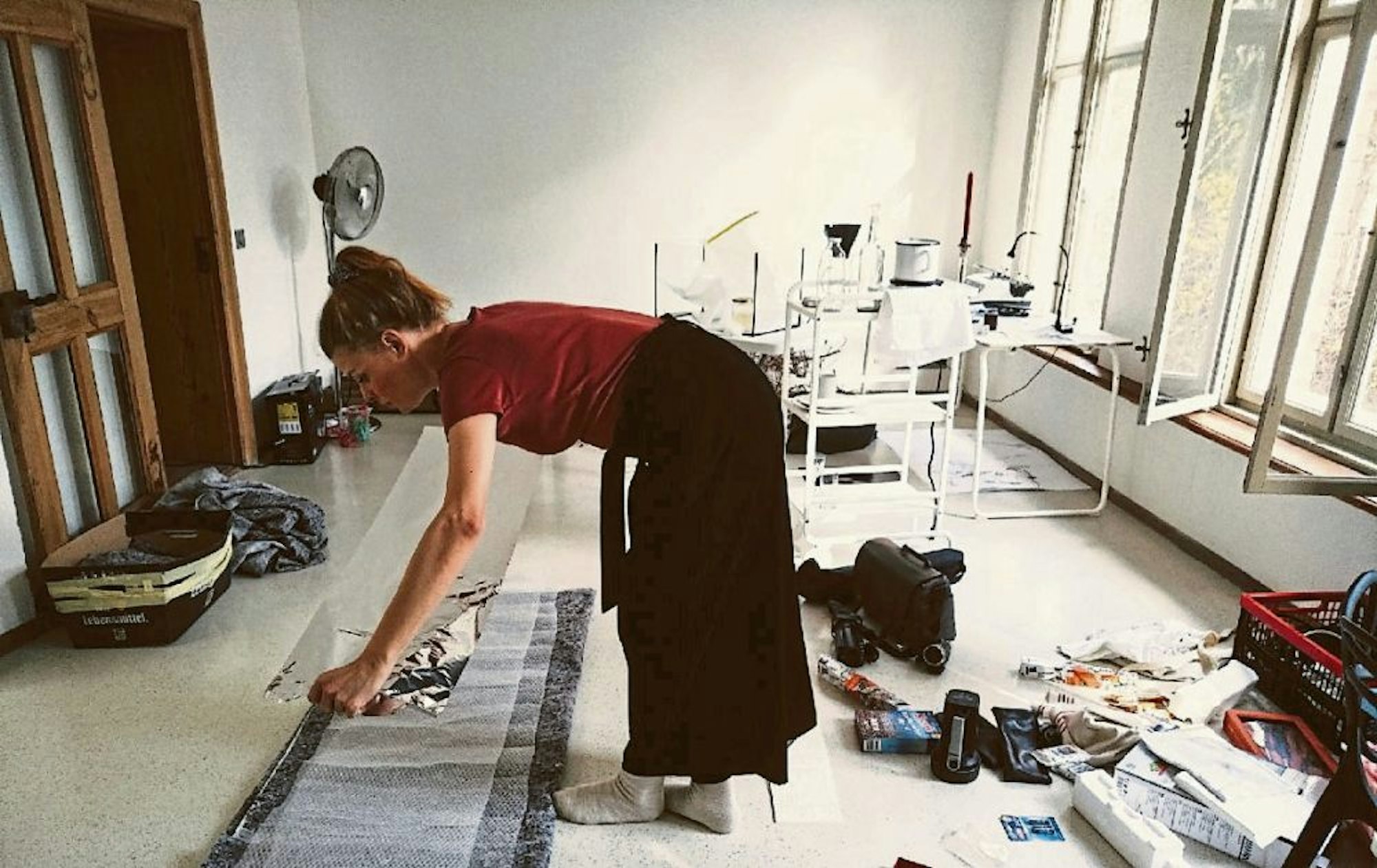 Die Künstlerin bereitet das Material für ihren Auftritt vor.
