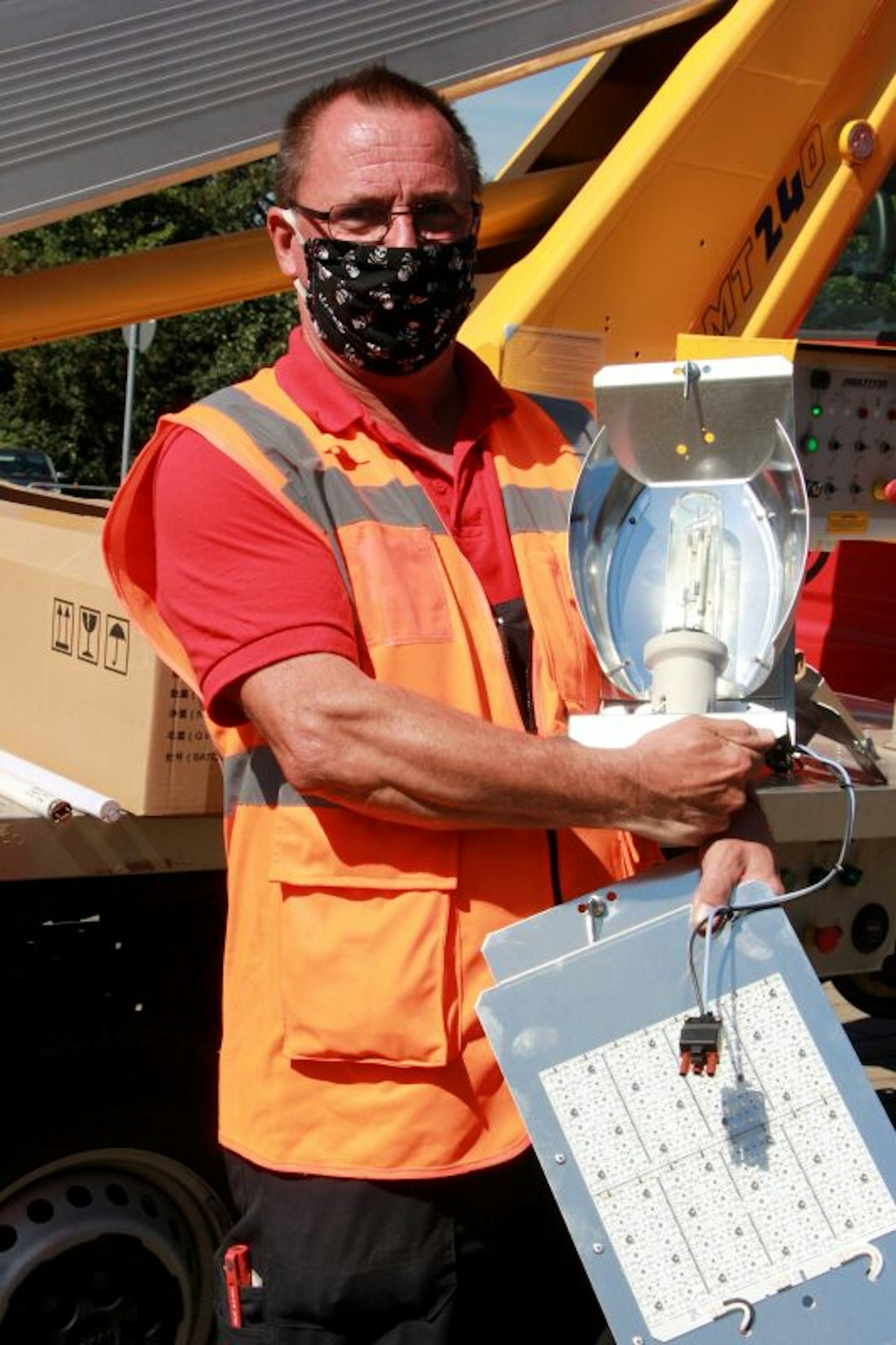 Während Özli mit dem Hubwagen zum Mast hochfährt, packt sein Kollege Volker Metternich schon die nächste LED-Platte aus. Er berichtet, dass die Leuchten unkompliziert gewechselt werden könnten. „Die Anschlüsse passen.“ Daher benötigt Özli keine drei Minuten für den Austausch in luftiger Höhe. Die meiste Zeit geht mit dem Rangieren des Wagens verloren. Für die wartenden Menschen am Bahnsteig ist das eine Abwechslung. Auch Schauspieler Markus Maria Profitlich schaut interessiert zu.