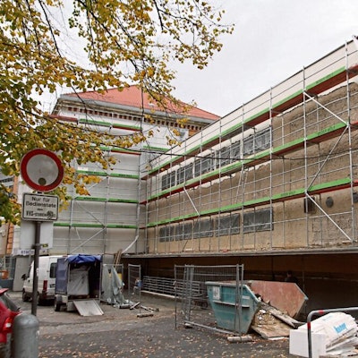 Gespenstisch wirkt derzeit die Fassade des Siegburger Rathauses, das saniert wird.