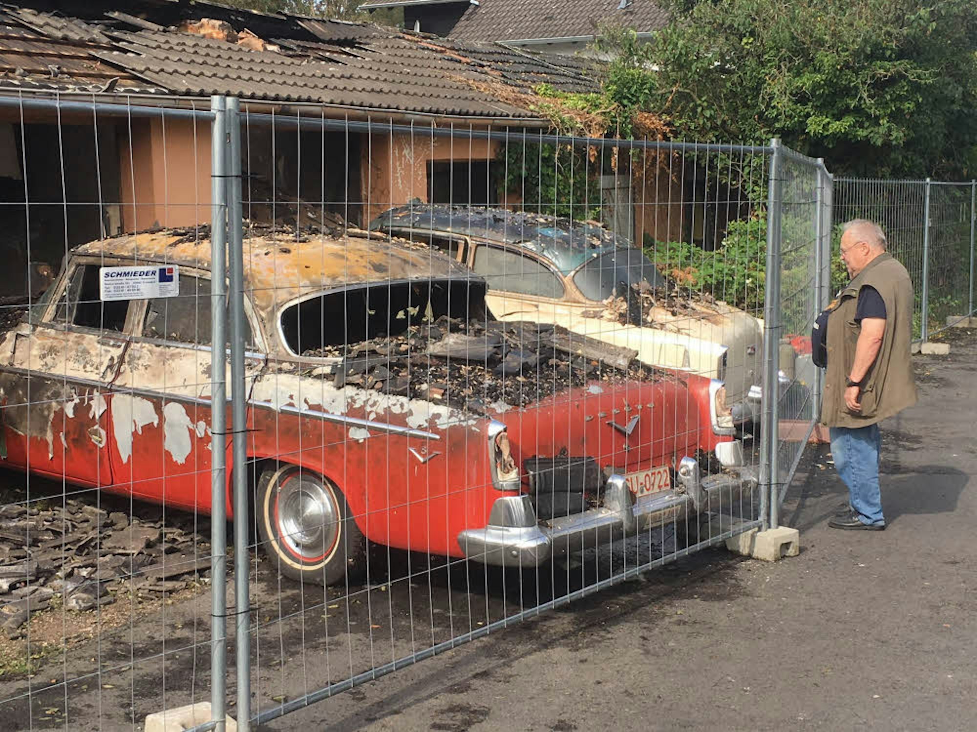 Die Brüder Knott stehen vor den Resten ihrer einstmals wunderschön restaurierten Oldtimer. „Ich habe geschlafen, als das Feuer kam. Das hörte sich an wie Granateneinschläge, durch die Luft flogen brennende Holzstücke“, sagt Rainer Knott. An zwei Wohnhäusern war das Feuer vorbeigelaufen, um anschließend die Garage in Brand zu setzen, in der der Desoto V 8 von 1954 und der Chevrolet Bel Air von 1954 standen. „Wir wissen noch gar nicht, ob wir da weiter wohnen können“, sagt Knott. Die Flammen waren auch in das Dach geschlagen.