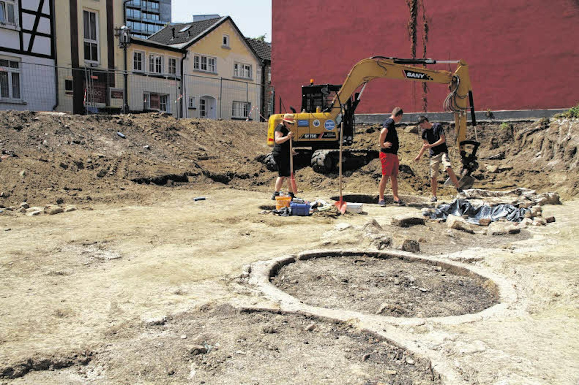 Mitarbeiter einer archäologische Fachfirma untersuchen derzeit in der sengenden Hitze sechs kreisförmige Einfassungen, die möglicherweise auf einen Brunnen und die Becken einer Gerberei oder einer Färberei hinweisen. Dabei stimmen sie sich mit dem Landschaftsverband Rheinland ab.