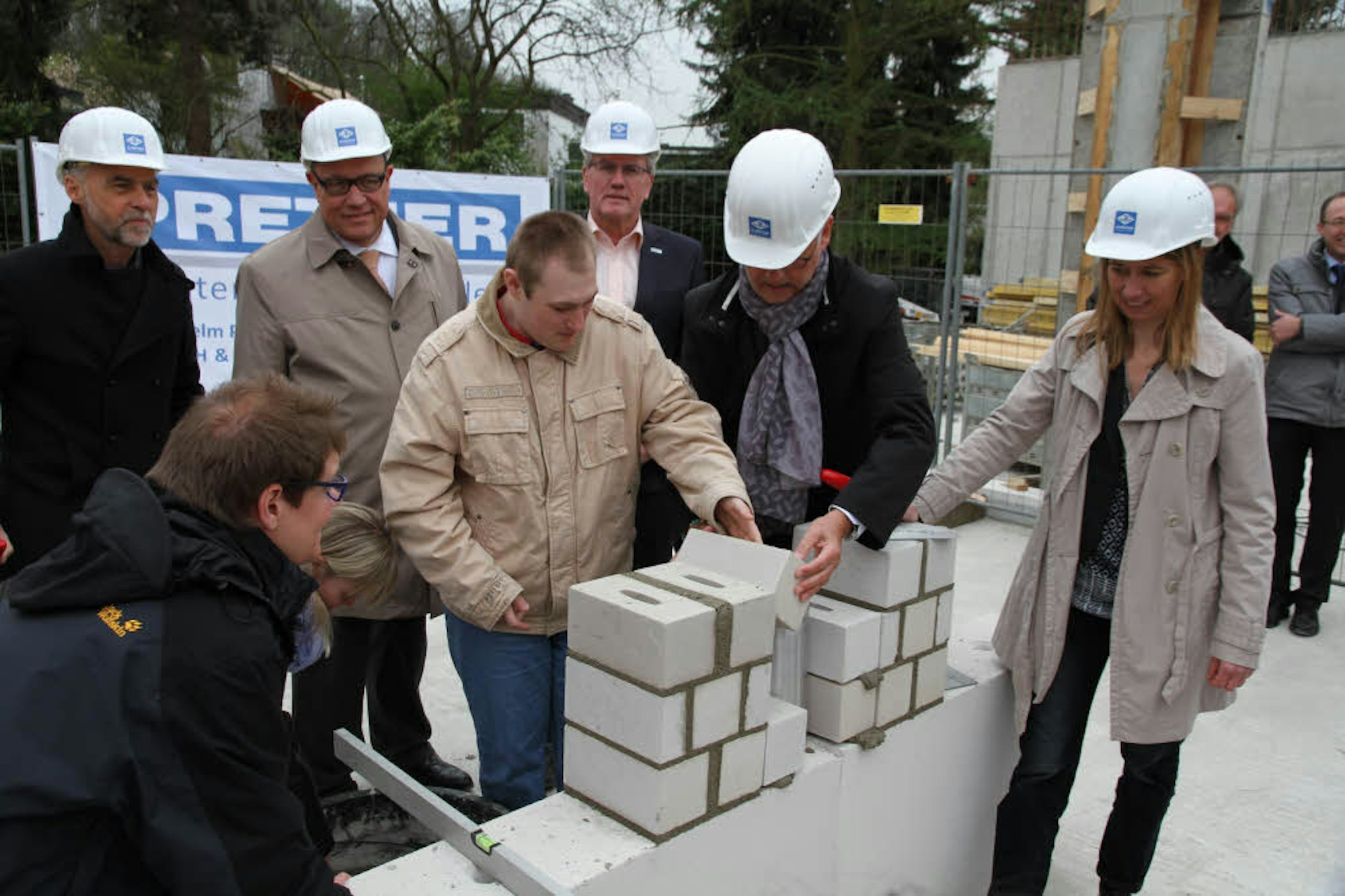 Grundsteinlegung mit Architekt Wilhelm Schulte (hinten links), Dr. Theodor-Michael Lucas, Josefs-Gesellschaft, dem künftigen Bewohner Peter Gedanitz, Landrat Sebastian Schuster, Bürgermeister Franz Huhn und Heimleiterin Sonja Boddenberg.