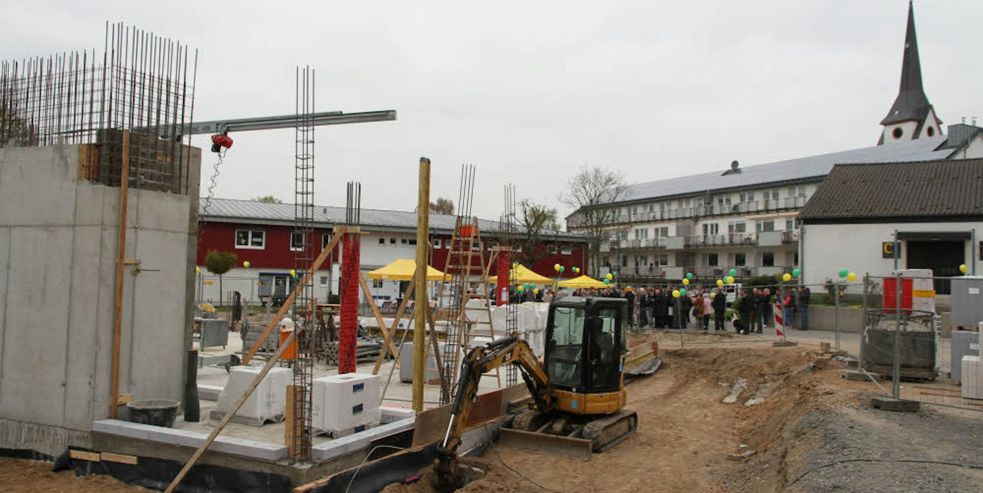 Vertreter der Bauherren, zukünftige Bewohner sowie deren Eltern, Landrat Sebastian Schuster, Bürgermeister Franz Huhn und viele weitere Gäste kamen auf der Baustelle zur feierlichen Grundsteinlegung zusammen. Im kommenden den März soll Einweihung gefeiert werden.