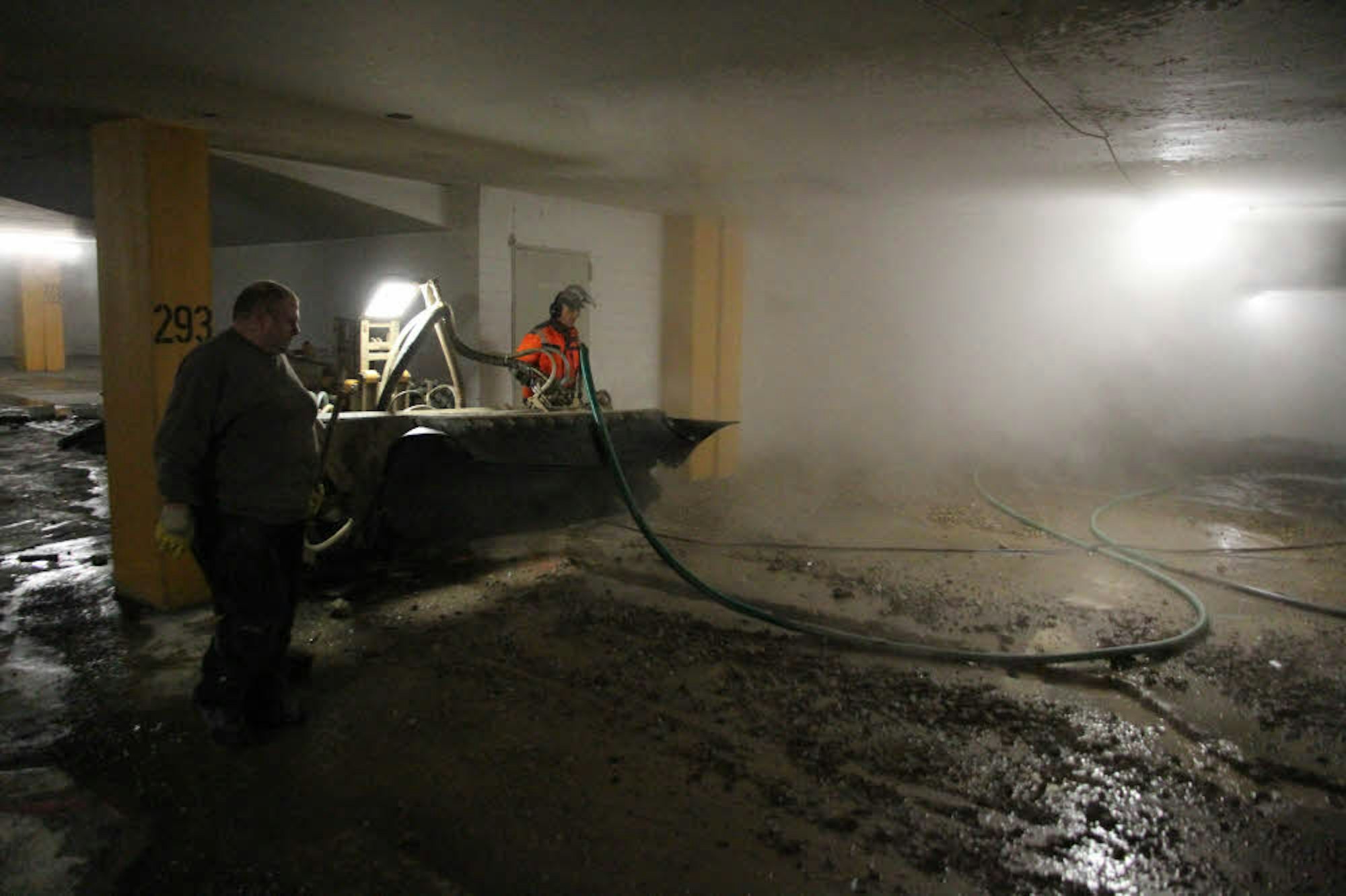 Bis dahin bekommt das wichtigste Werkzeug auf der Baustelle noch eine Menge zu tun: ein wuchtiges Kettenfahrzeug, mit einer Ultrahochdruck-Pumpe ausgerüstet, die den maroden Beton einfach wegspritzt und für reichlich Sprühnebel im Bau sorgt. Das Vorgehen erläutert Ingo Nebel, Fachbereichsleiter der Stadtbetriebe: Zum einen orientiere man sich in den Rissen in den Böden, zum anderen seien ständig Statiker vor Ort, die weitere Schwachstellen ausmachten. Dann wird die Stahlbewehrung freigelegt und bei Bedarf erneuert.