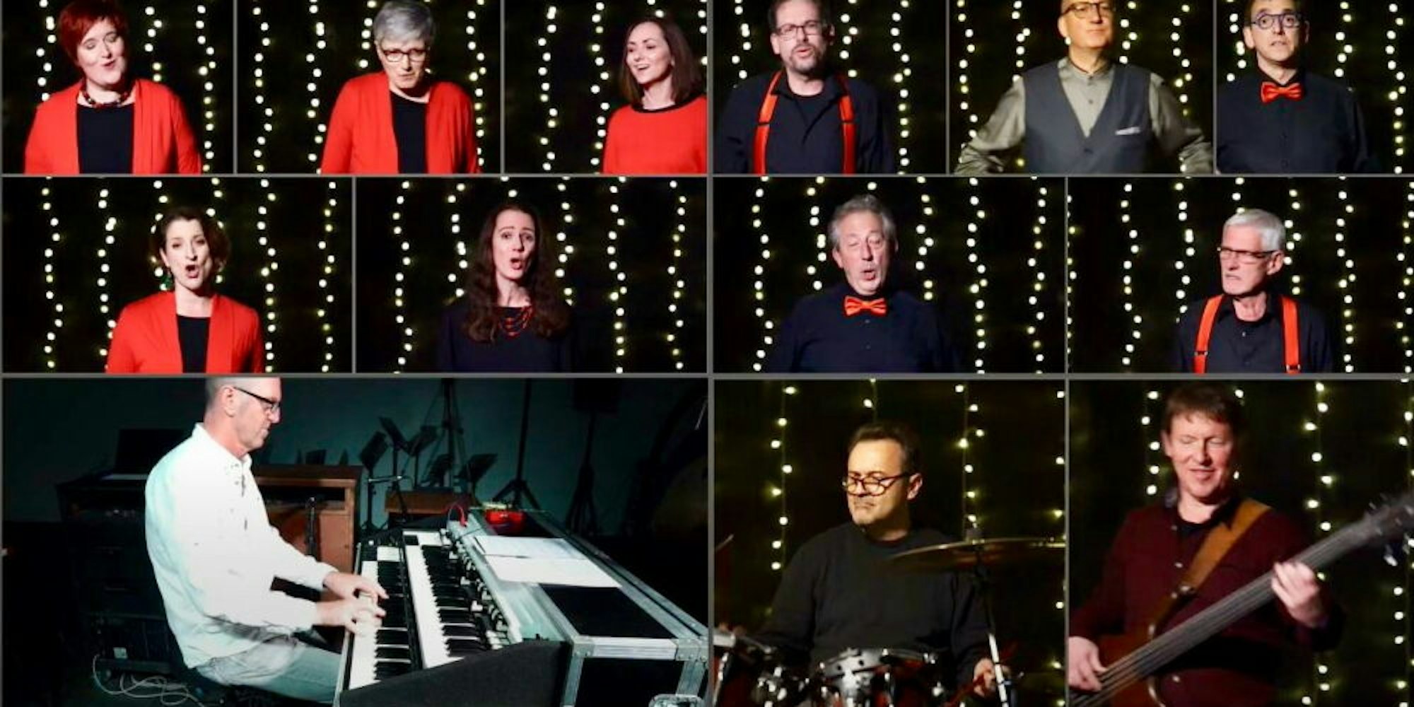 Auf einen Blick: alle neun Sängerinnen und Sänger, Hans-Peter Herkenhöhner (am Keyboard), Uli Poth am Schlagzeug, Wendel Biskup am Bass und der Dirigent Stefan Wurm (oben, Zweiter von rechts).