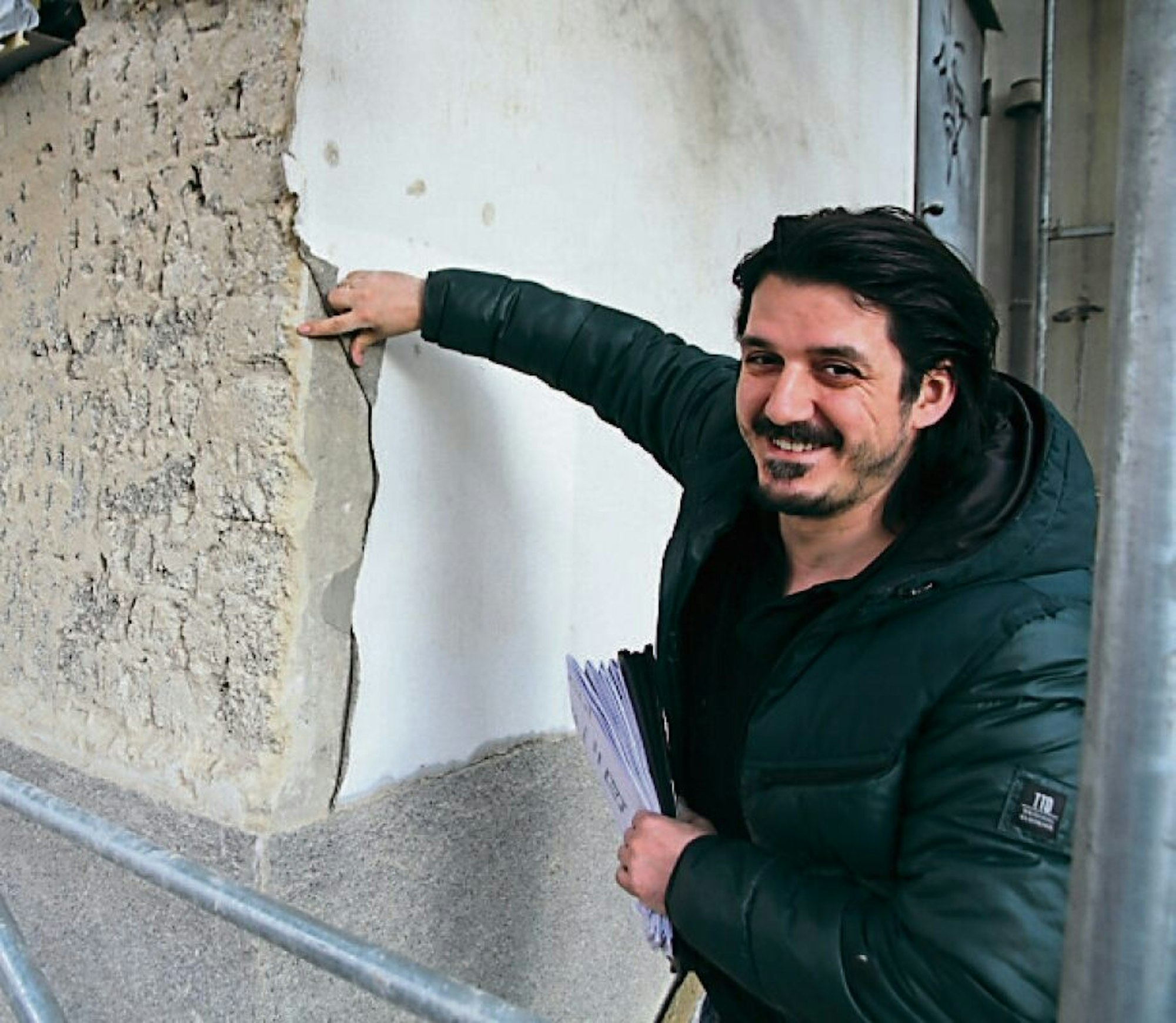 Erneuert wird auch der dunklere Putz des Sockels, der bei näherem Hinsehen aus grauem Zement mit Einsprengseln aus schwarzen, weißen und ockerfarbigen Bröckchen besteht: Lemonakis geht davon aus, dass es sich dabei um Quarz, Marmor und zerstückelte Klinker handelt, die sich auch in der Fassade des Altbaus aus der Kaiserzeit finden. Auch dieser Putz wird ersetzt. „Das geht nicht mit Lagerware“, sagt der Bauleiter. Er hat Kontakt zu einer Firma aufgenommen, die Erfahrung mit den nötigen Beimischungen hat. Aufgefallen ist Lemonakis, wie eng die beiden Putzschichten miteinander verbunden sind. „Da wurde nass in nass gearbeitet“, erläutert er, die Verbindung habe überall am Gebäude gehalten. Rund 150 000 Euro soll der neue Putz insgesamt kosten.