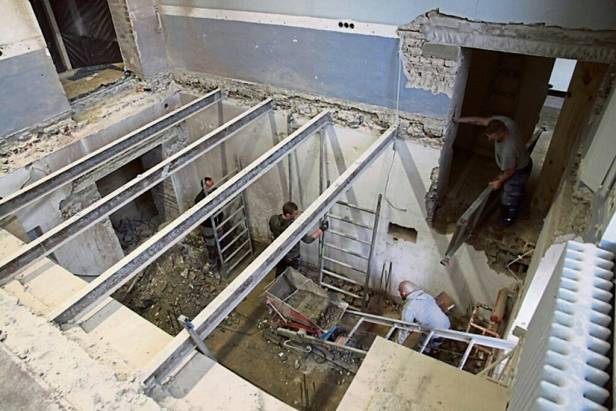 Schicht um Schicht: Auf großen Flächen ist der alte Putz bereits heruntergeschlagen und gibt den Blick auf das Mauerwerk frei.
