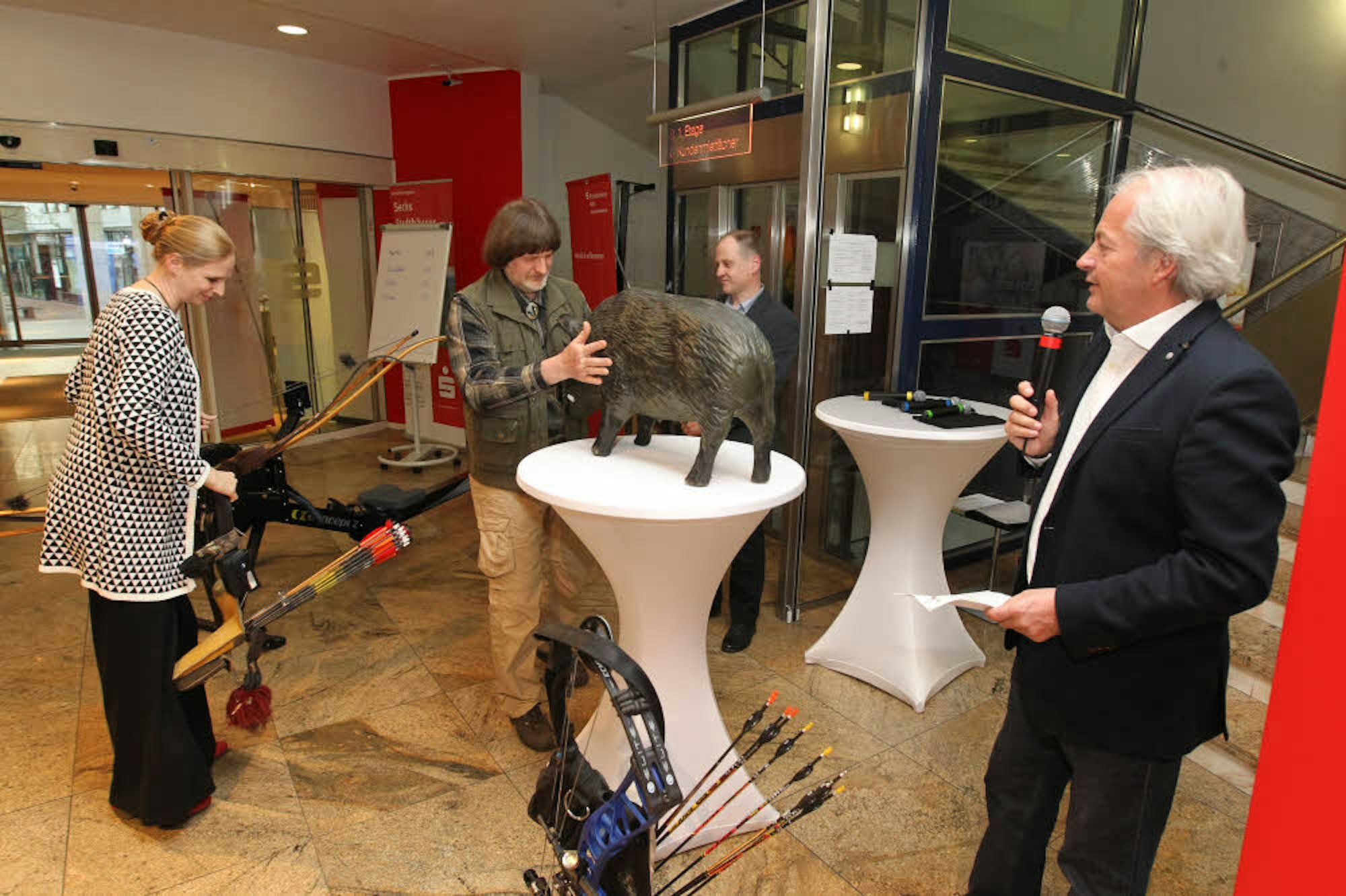 Bernhard Tenten aus Siegburg (l.) erklärte Moderator Jürgen Schmitz (r.) die Ziele des 3 D-Bogenschießens an einer Wildschweinfigur.