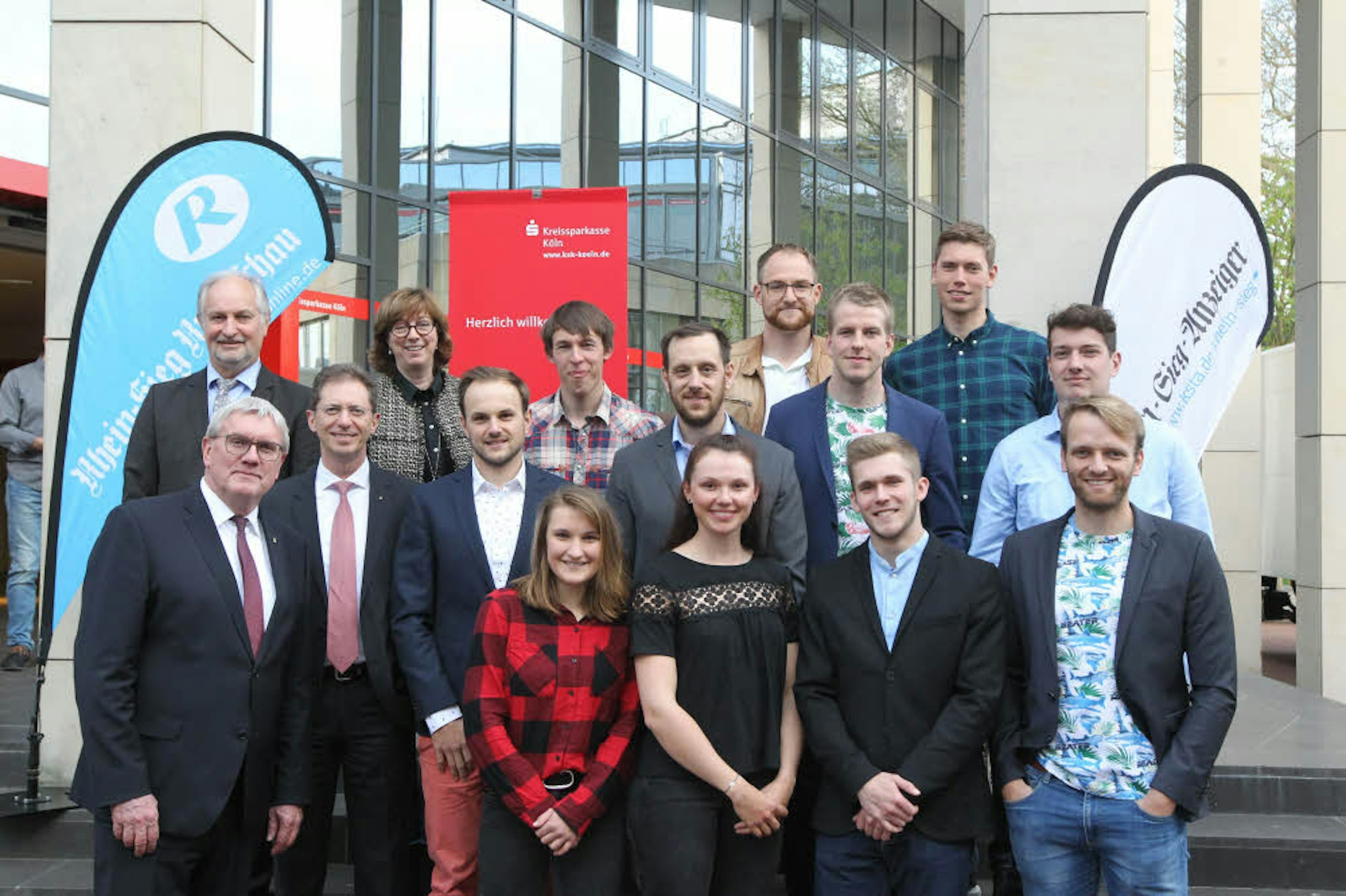Die Sieger der Sportlerwahl 2018 mit Gratulanten vor der Kreissparkasse Köln in Siegburg