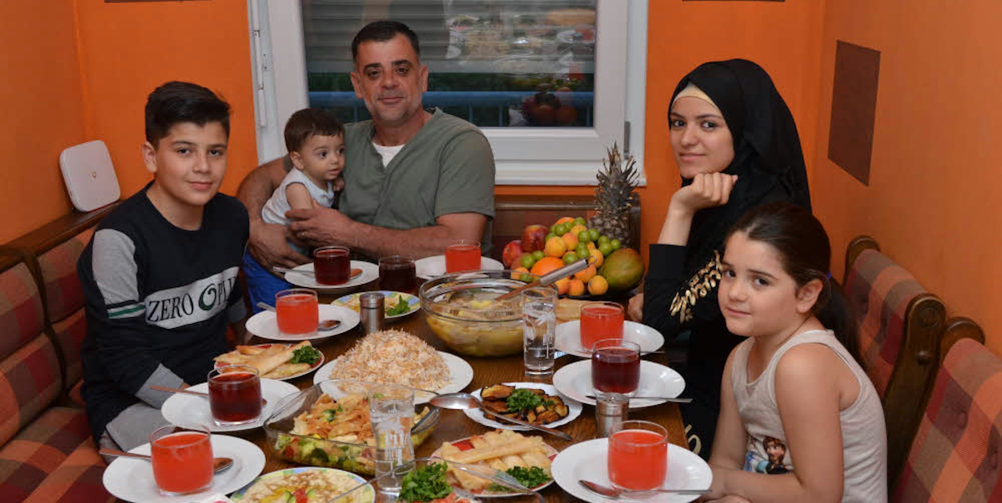 Fastenbrechen im Ramadan: Anoar Abo Harb (mit Kopftuch) und ihr Bruder Yassin,Vater Jamil Abo Harb und Schwester Nezma sitzen am reich gedeckten Tisch in ihrer Wohnung in der Flüchtlingsunterkunft in Siegburg.