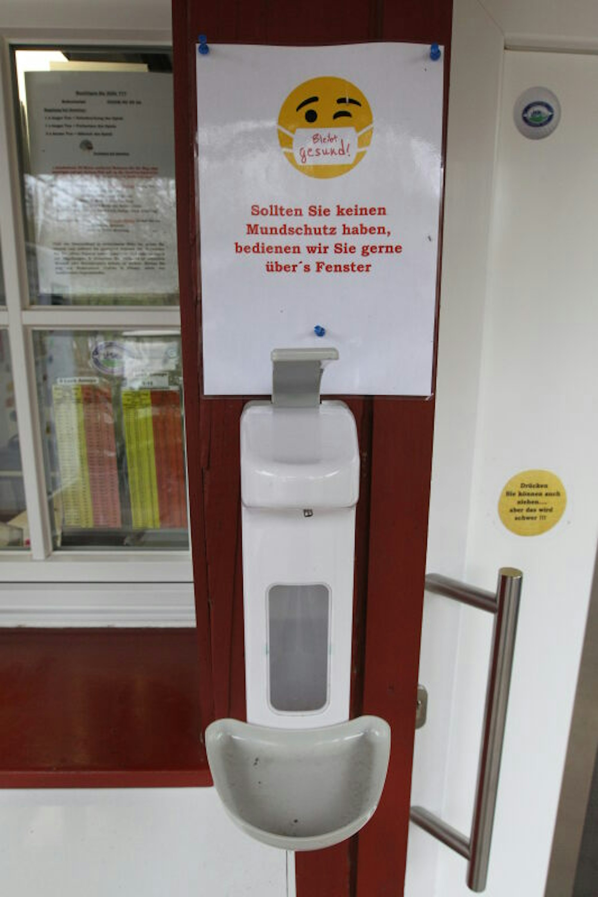 Desinfektionsspender sind mittlerweile Standard; Clubmanager Nico Rasche vom Golfclub Schloss Auel in Lohmar-Wahlscheid fährt auf der Anlage mit seinem Golfkart (rechts) über das Areal.