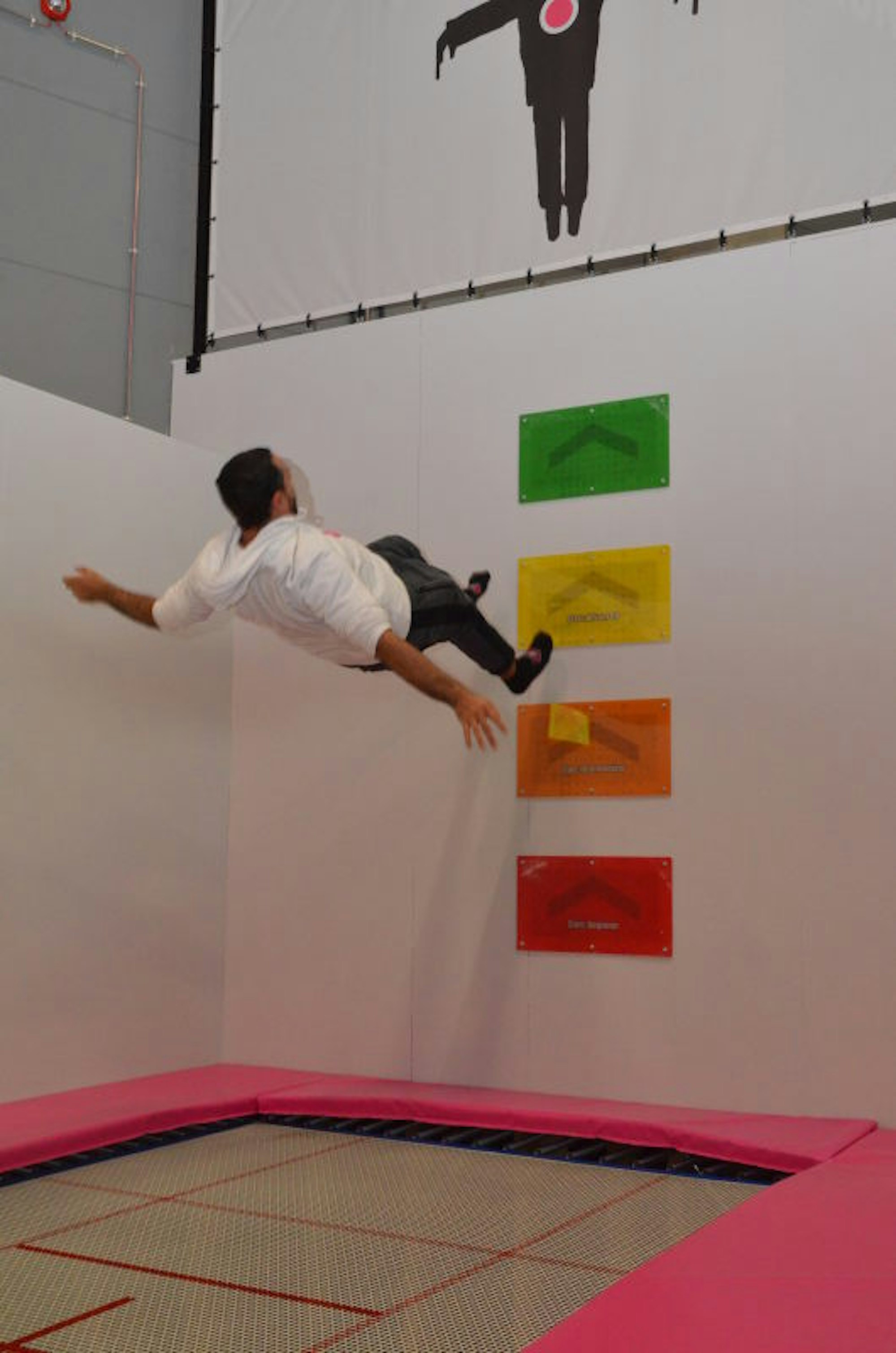 Mehr als 60 unterschiedliche Trampoline finden hier Platz, auch auf ein „Ninja“-Geschicklichkeitsparcours und eine Flugseilbahn unter der Decke lockt die Besucher. Unter den Trampolinen fallen die so genannten Tumble Tracks auf, extra lange Trampolinbahnen, auf denen man schon am Eröffnungstag die ersten Turnerinnen Flick-Flack und andere akrobatische Elemente ihres Sports trainieren sah.
