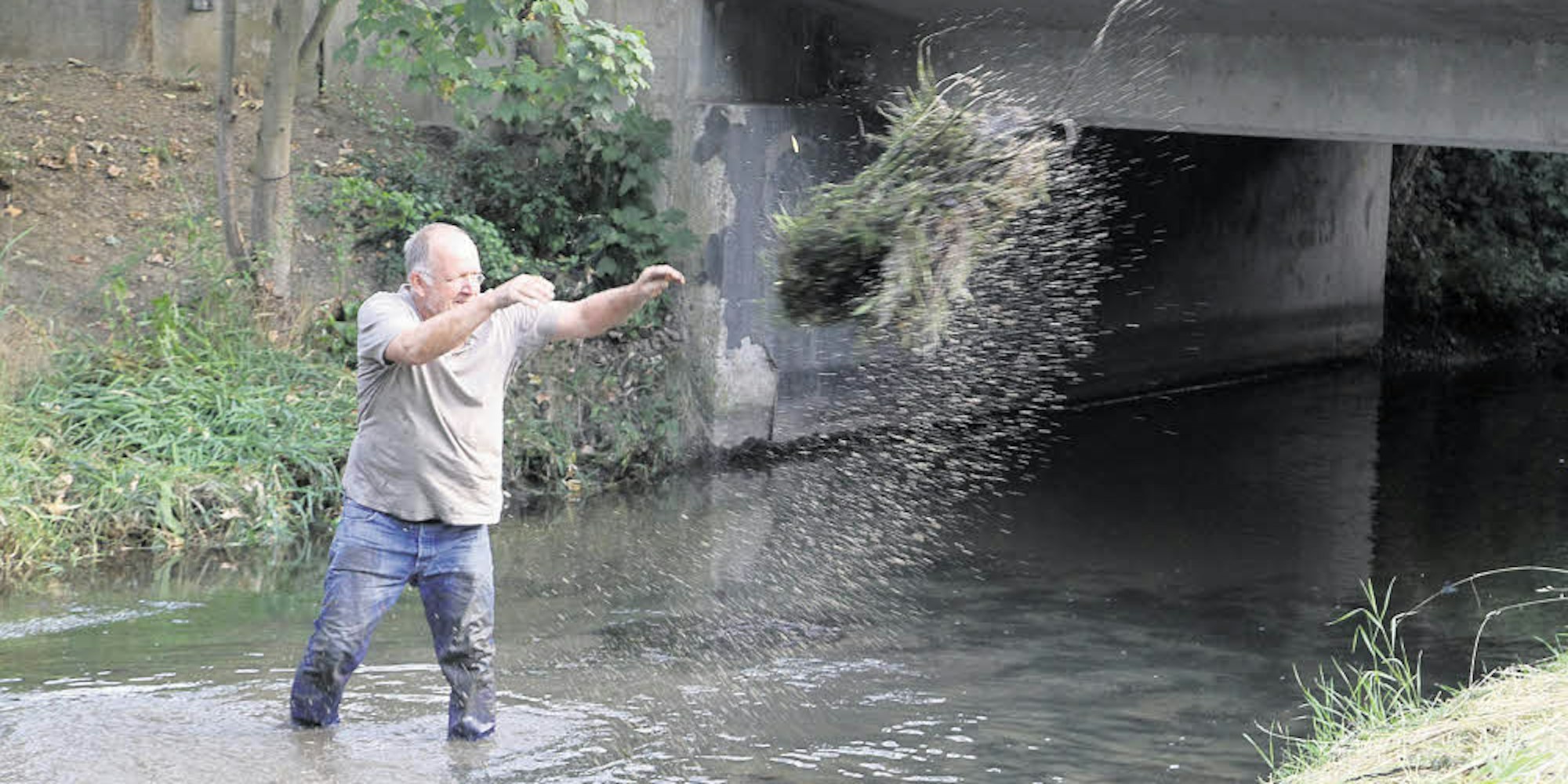 An vier Gartenbau-Betrieben sind die Arbeiten vergeben worden. „Wir haben darauf geachtet, ansässige Unternehmen auszuwählen“, sagt Diplom-Chemiker Dr. André Baade vom Troisdorfer Abwasserbetrieb und schaut Georg Lenz dabei zu, wie der Chef des gleichnamigen Garten- und Landschaftsbaubetriebs an der Brücke an der Meindorfer Straße in Sieglar bündelweise Algen aus dem Mühlengraben zieht. Lenz steht knietief im Bachlauf.