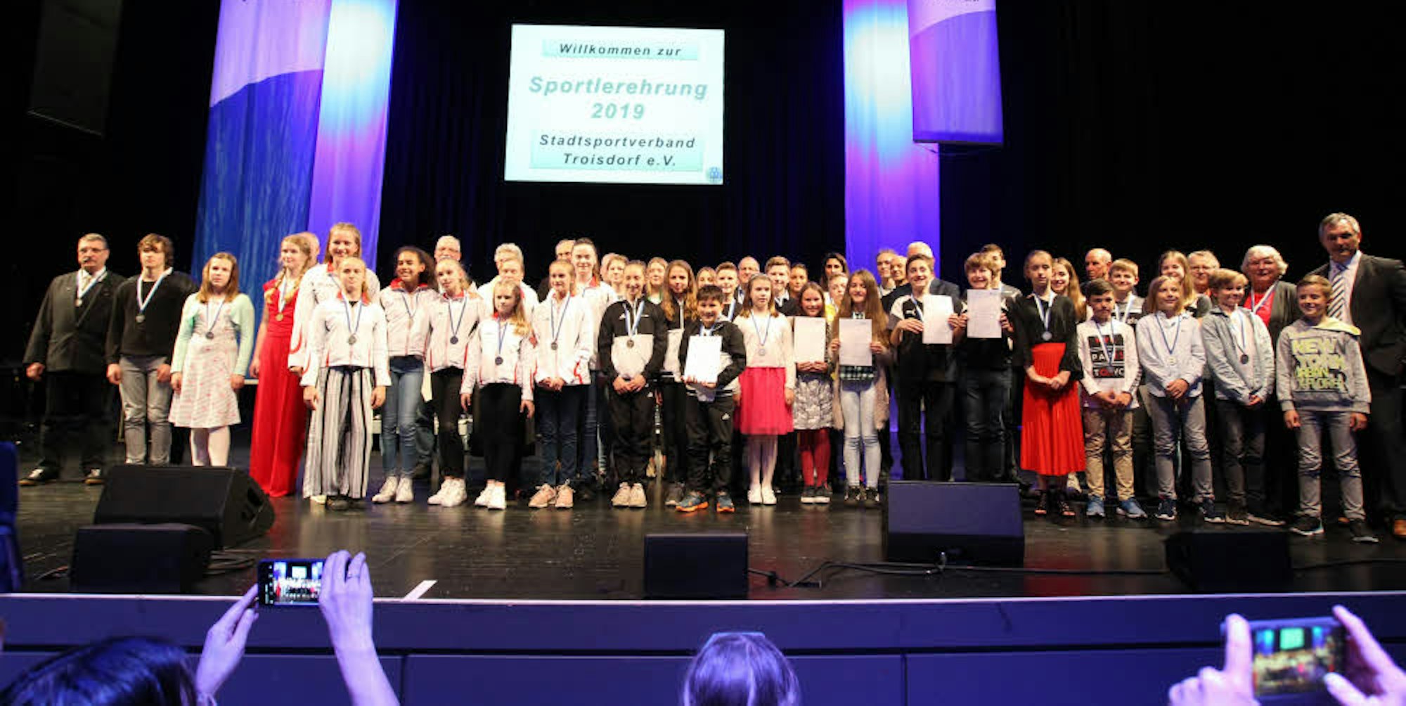 Am Ende der Sportlerehrung des Stadtsportbundes Troisdorf versammelten sich alle Geehrten mit Medaillen und Urkunden auf der Bühne.