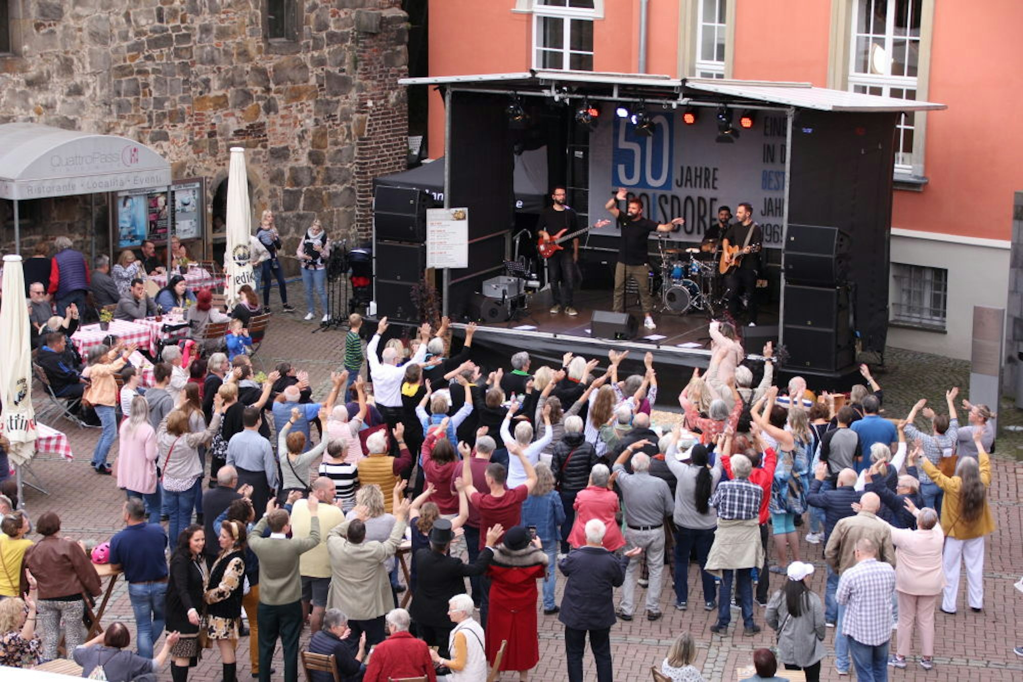 Wolfgang Schmitz-Mertens reichte selbst gerösteten Kaffee über die Theke, Julia Becker ein Stück weiter kalt gepresste Öle. Die Truppe verkaufte im siebten Jahr schon für den guten Zweck, mehr als 10 000 Euro kamen bereits zusammen. Und die Musik war abgestimmt auf die 50 Jahre, von „Beatles Revival Band“ über „Die goldenen Reiter“ bis zum „Dynamischen Duo“.