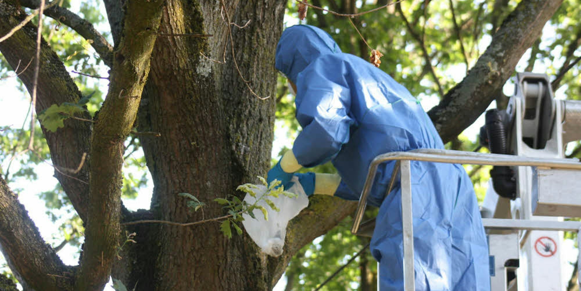 Troisdorf – Die Gefahr kommt ausgesprochen unscheinbar daher. Gerade einmal etwas mehr als handflächengroß ist das Gespinst, dem sich Stephan Vester am Donnerstagmorgen mit großer Vorsicht nähert. Der Mitarbeiter des Sankt Augustiner Baumpflegeunternehmens Arbor Care trägt einen blauen Overall mit Kapuze, Handschuhe, die mit Klebeband luftdicht mit den Ärmeln des Schutzanzuges verbunden sind, und einen Mundschutz.