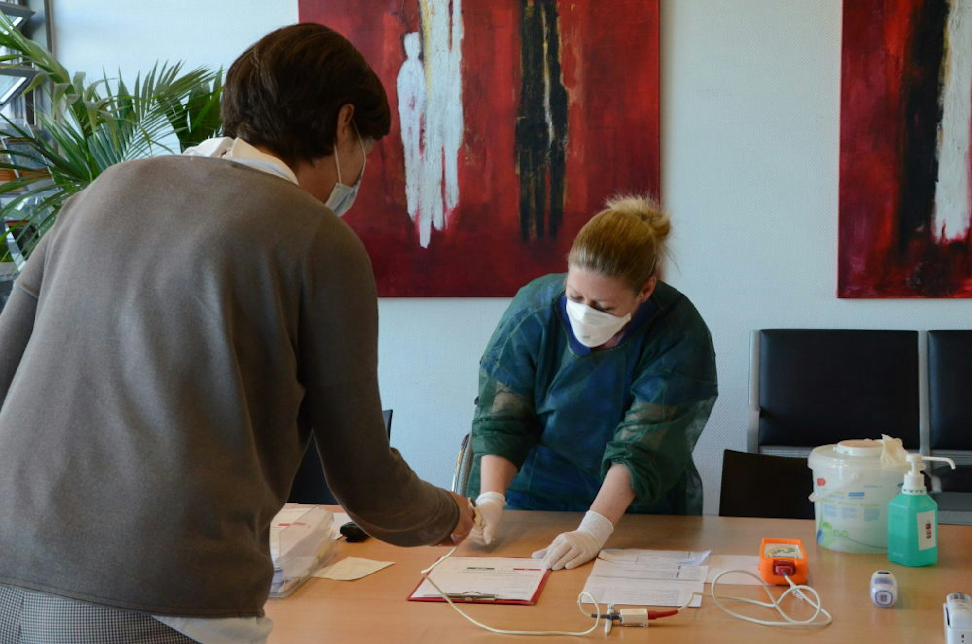 „Kurz-Triage“ am Eingang in Sieglar: Hier wird versucht, durch gezielte Fragen und Fiebermessen mögliche Infektionen zu erkennen.
