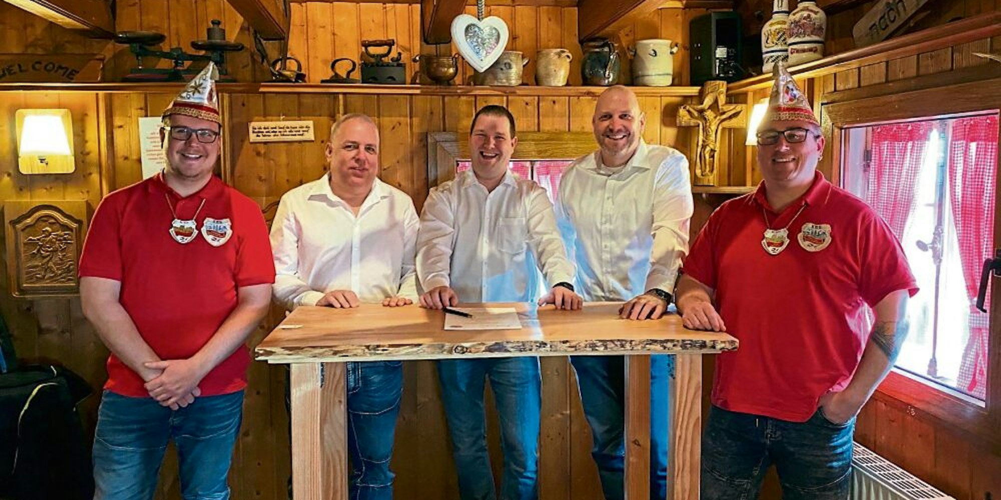 Die jecken Herrscher stehen bereit: René Schäfer (l.) und Jens Himmelreich (r.) vom Karnevalsausschuss stellten Markus Zimmermann, Thorsten Mahler und Michael Pütz (v. l.) als künftiges Trifolium vor.