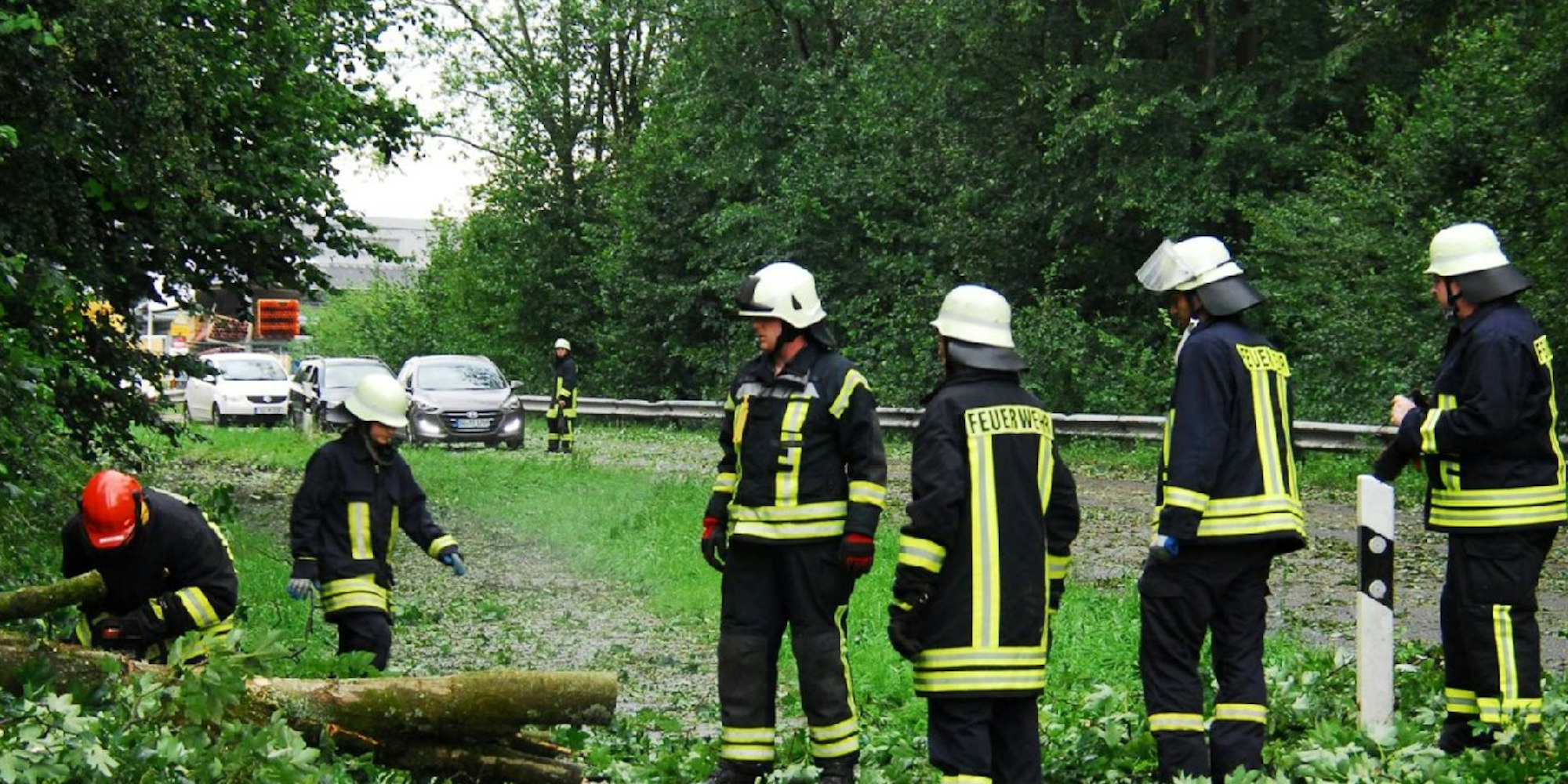 Die Feuerwehren waren im Dauereinsatz, vor allem in Ruppichteroth, Hennef, Siegburg, Neunkirchen-Seelscheid und Sankt Augustin. In Winterscheid waren die Helfer selber betroffen. Eine Sturmböe hob beim Feuerwehrfest eine kleine Imbissbude an und warf sie um, mit drei Menschen darin. Die hatten Glück, kamen mit kleinen Kratzern davon. Der Oldtimer von 1957 wurde erheblich beschädigt. Auf der Bröltalstrecke, der Schlossstraße bei Allner, der Landstraße 352 bei Wolperath lagen Stämme quer. Der Verkehr musste gestoppt werden. In Eitorf-Bohlscheid wurde ein Mann von einem Hagelkorn am Arm getroffen und verletzt.