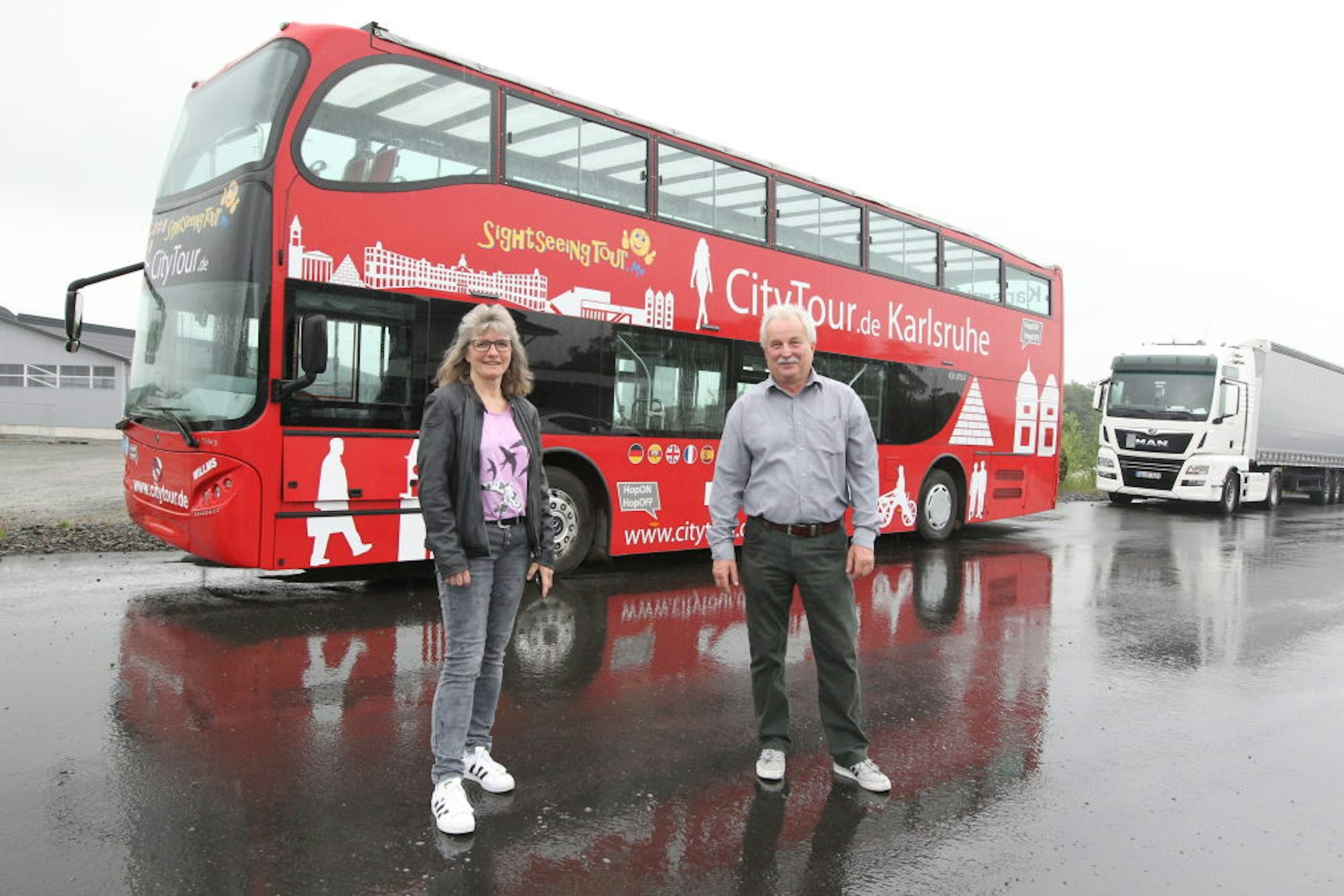 Stopp für alle City-Rundfahrten: Geschäftsführerin Ulrike Willms und Inhaber Wolfgang Willms vor dem Karlsruhe-Bus.